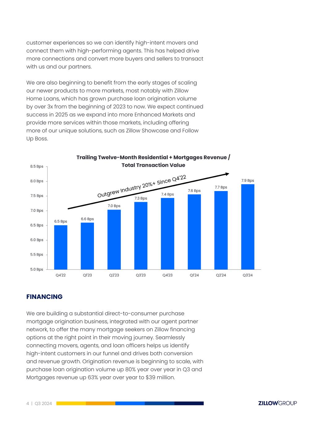 customer experiences so we can identify high-intent movers and connect them with high-performing agents. This has helped drive more connections and convert more buyers and sellers to transact with us and our partners. We are also beginning to benefit from the early stages of scaling our newer products to more markets, most notably with Zillow Home Loans, which has grown purchase loan origination volume by over 3x from the beginning of 2023 to now. We expect continued success in 2025 as we expand into more Enhanced Markets and provide more services within those markets, including offering more of our unique solutions, such as Zillow Showcase and Follow Up Boss. FINANCING We are building a substantial direct-to-consumer purchase mortgage origination business, integrated with our agent partner network, to offer the many mortgage seekers on Zillow financing options at the right point in their moving journey. Seamlessly connecting movers, agents, and loan officers helps us identify high-intent customers in our funnel and drives both conversion and revenue growth. Origination revenue is beginning to scale, with purchase loan origination volume up 80% year over year in Q3 and Mortgages revenue up 63% year over year to $39 million. 4 | Q3 2024
