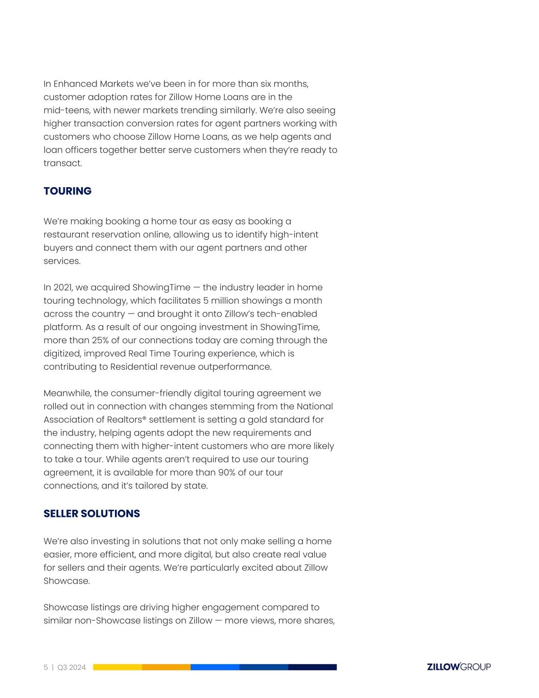 In Enhanced Markets we’ve been in for more than six months, customer adoption rates for Zillow Home Loans are in the mid-teens, with newer markets trending similarly. We’re also seeing higher transaction conversion rates for agent partners working with customers who choose Zillow Home Loans, as we help agents and loan officers together better serve customers when they’re ready to transact. TOURING We’re making booking a home tour as easy as booking a restaurant reservation online, allowing us to identify high-intent buyers and connect them with our agent partners and other services. In 2021, we acquired ShowingTime — the industry leader in home touring technology, which facilitates 5 million showings a month across the country — and brought it onto Zillow’s tech-enabled platform. As a result of our ongoing investment in ShowingTime, more than 25% of our connections today are coming through the digitized, improved Real Time Touring experience, which is contributing to Residential revenue outperformance. Meanwhile, the consumer-friendly digital touring agreement we rolled out in connection with changes stemming from the National Association of Realtors® settlement is setting a gold standard for the industry, helping agents adopt the new requirements and connecting them with higher-intent customers who are more likely to take a tour. While agents aren’t required to use our touring agreement, it is available for more than 90% of our tour connections, and it’s tailored by state. SELLER SOLUTIONS We’re also investing in solutions that not only make selling a home easier, more efficient, and more digital, but also create real value for sellers and their agents. We’re particularly excited about Zillow Showcase. Showcase listings are driving higher engagement compared to similar non-Showcase listings on Zillow — more views, more shares, 5 | Q3 2024