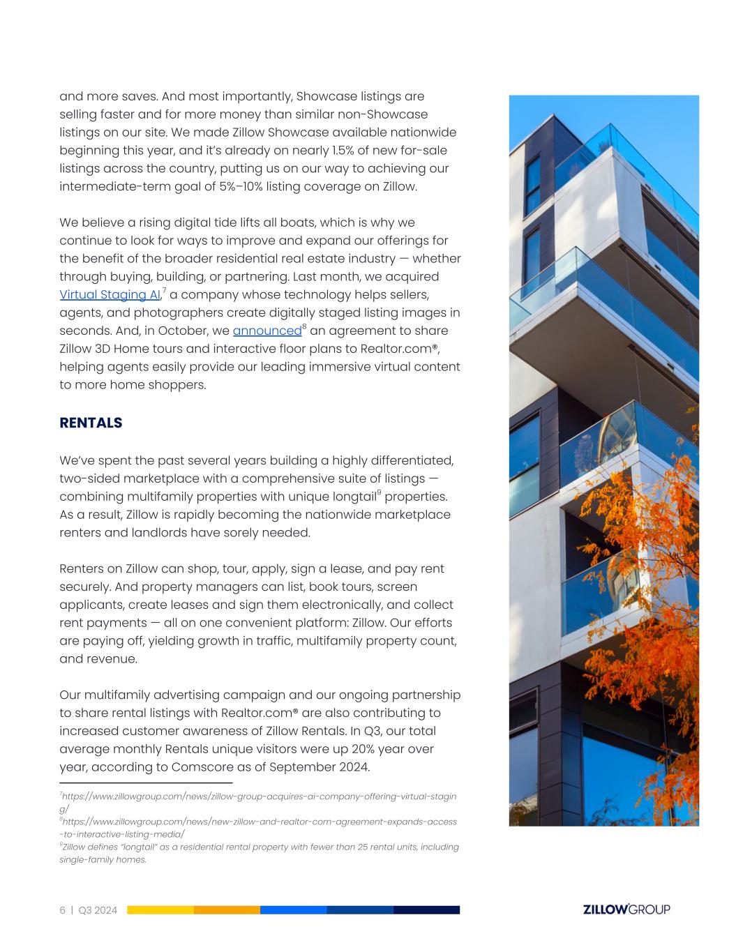 and more saves. And most importantly, Showcase listings are selling faster and for more money than similar non-Showcase listings on our site. We made Zillow Showcase available nationwide beginning this year, and it’s already on nearly 1.5% of new for-sale listings across the country, putting us on our way to achieving our intermediate-term goal of 5%–10% listing coverage on Zillow. We believe a rising digital tide lifts all boats, which is why we continue to look for ways to improve and expand our offerings for the benefit of the broader residential real estate industry — whether through buying, building, or partnering. Last month, we acquired Virtual Staging AI,7 a company whose technology helps sellers, agents, and photographers create digitally staged listing images in seconds. And, in October, we announced8 an agreement to share Zillow 3D Home tours and interactive floor plans to Realtor.com®, helping agents easily provide our leading immersive virtual content to more home shoppers. RENTALS We’ve spent the past several years building a highly differentiated, two-sided marketplace with a comprehensive suite of listings — combining multifamily properties with unique longtail9 properties. As a result, Zillow is rapidly becoming the nationwide marketplace renters and landlords have sorely needed. Renters on Zillow can shop, tour, apply, sign a lease, and pay rent securely. And property managers can list, book tours, screen applicants, create leases and sign them electronically, and collect rent payments — all on one convenient platform: Zillow. Our efforts are paying off, yielding growth in traffic, multifamily property count, and revenue. Our multifamily advertising campaign and our ongoing partnership to share rental listings with Realtor.com® are also contributing to increased customer awareness of Zillow Rentals. In Q3, our total average monthly Rentals unique visitors were up 20% year over year, according to Comscore as of September 2024. 9Zillow defines “longtail” as a residential rental property with fewer than 25 rental units, including single-family homes. 8https://www.zillowgroup.com/news/new-zillow-and-realtor-com-agreement-expands-access -to-interactive-listing-media/ 7https://www.zillowgroup.com/news/zillow-group-acquires-ai-company-offering-virtual-stagin g/ 6 | Q3 2024
