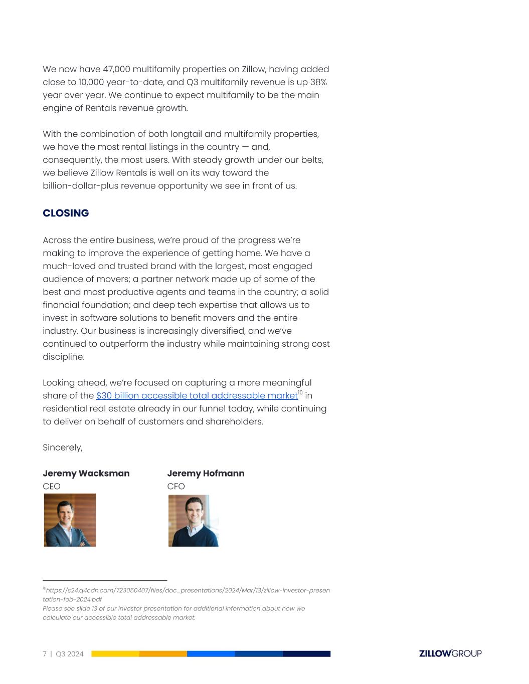 We now have 47,000 multifamily properties on Zillow, having added close to 10,000 year-to-date, and Q3 multifamily revenue is up 38% year over year. We continue to expect multifamily to be the main engine of Rentals revenue growth. With the combination of both longtail and multifamily properties, we have the most rental listings in the country — and, consequently, the most users. With steady growth under our belts, we believe Zillow Rentals is well on its way toward the billion-dollar-plus revenue opportunity we see in front of us. CLOSING Across the entire business, we’re proud of the progress we’re making to improve the experience of getting home. We have a much-loved and trusted brand with the largest, most engaged audience of movers; a partner network made up of some of the best and most productive agents and teams in the country; a solid financial foundation; and deep tech expertise that allows us to invest in software solutions to benefit movers and the entire industry. Our business is increasingly diversified, and we’ve continued to outperform the industry while maintaining strong cost discipline. Looking ahead, we’re focused on capturing a more meaningful share of the $30 billion accessible total addressable market10 in residential real estate already in our funnel today, while continuing to deliver on behalf of customers and shareholders. Sincerely, JeremyWacksman JeremyHofmann CEO CFO 10https://s24.q4cdn.com/723050407/files/doc_presentations/2024/Mar/13/zillow-investor-presen tation-feb-2024.pdf Please see slide 13 of our investor presentation for additional information about how we calculate our accessible total addressable market. 7 | Q3 2024
