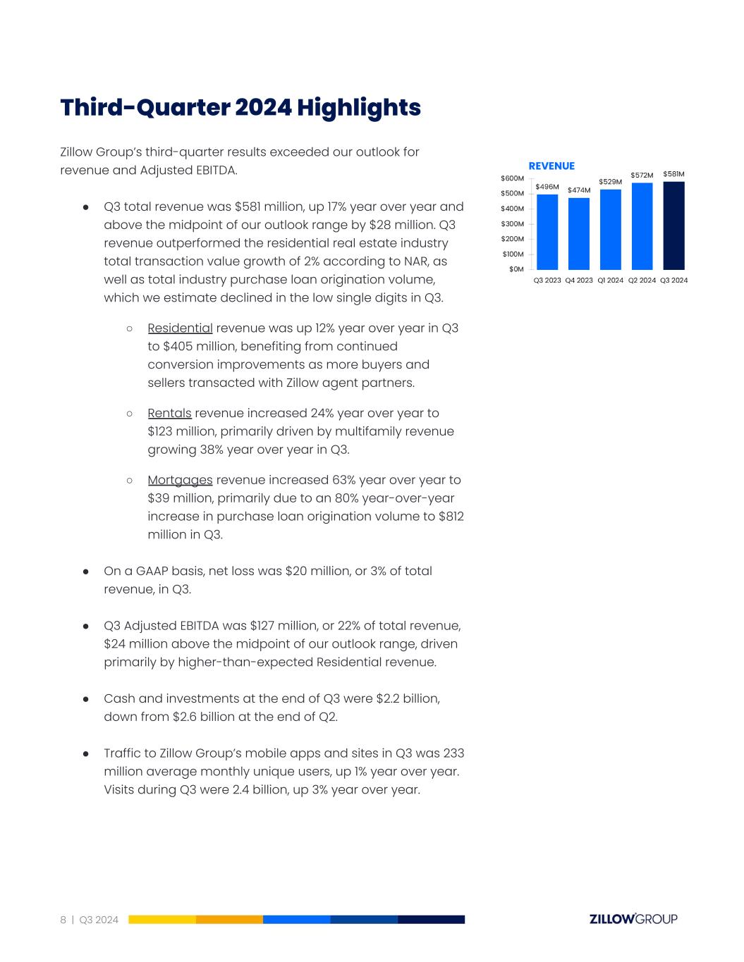 Third-Quarter 2024Highlights Zillow Group’s third-quarter results exceeded our outlook for revenue and Adjusted EBITDA. ● Q3 total revenue was $581 million, up 17% year over year and above the midpoint of our outlook range by $28 million. Q3 revenue outperformed the residential real estate industry total transaction value growth of 2% according to NAR, as well as total industry purchase loan origination volume, which we estimate declined in the low single digits in Q3. ○ Residential revenue was up 12% year over year in Q3 to $405 million, benefiting from continued conversion improvements as more buyers and sellers transacted with Zillow agent partners. ○ Rentals revenue increased 24% year over year to $123 million, primarily driven by multifamily revenue growing 38% year over year in Q3. ○ Mortgages revenue increased 63% year over year to $39 million, primarily due to an 80% year-over-year increase in purchase loan origination volume to $812 million in Q3. ● On a GAAP basis, net loss was $20 million, or 3% of total revenue, in Q3. ● Q3 Adjusted EBITDA was $127 million, or 22% of total revenue, $24 million above the midpoint of our outlook range, driven primarily by higher-than-expected Residential revenue. ● Cash and investments at the end of Q3 were $2.2 billion, down from $2.6 billion at the end of Q2. ● Traffic to Zillow Group’s mobile apps and sites in Q3 was 233 million average monthly unique users, up 1% year over year. Visits during Q3 were 2.4 billion, up 3% year over year. 8 | Q3 2024