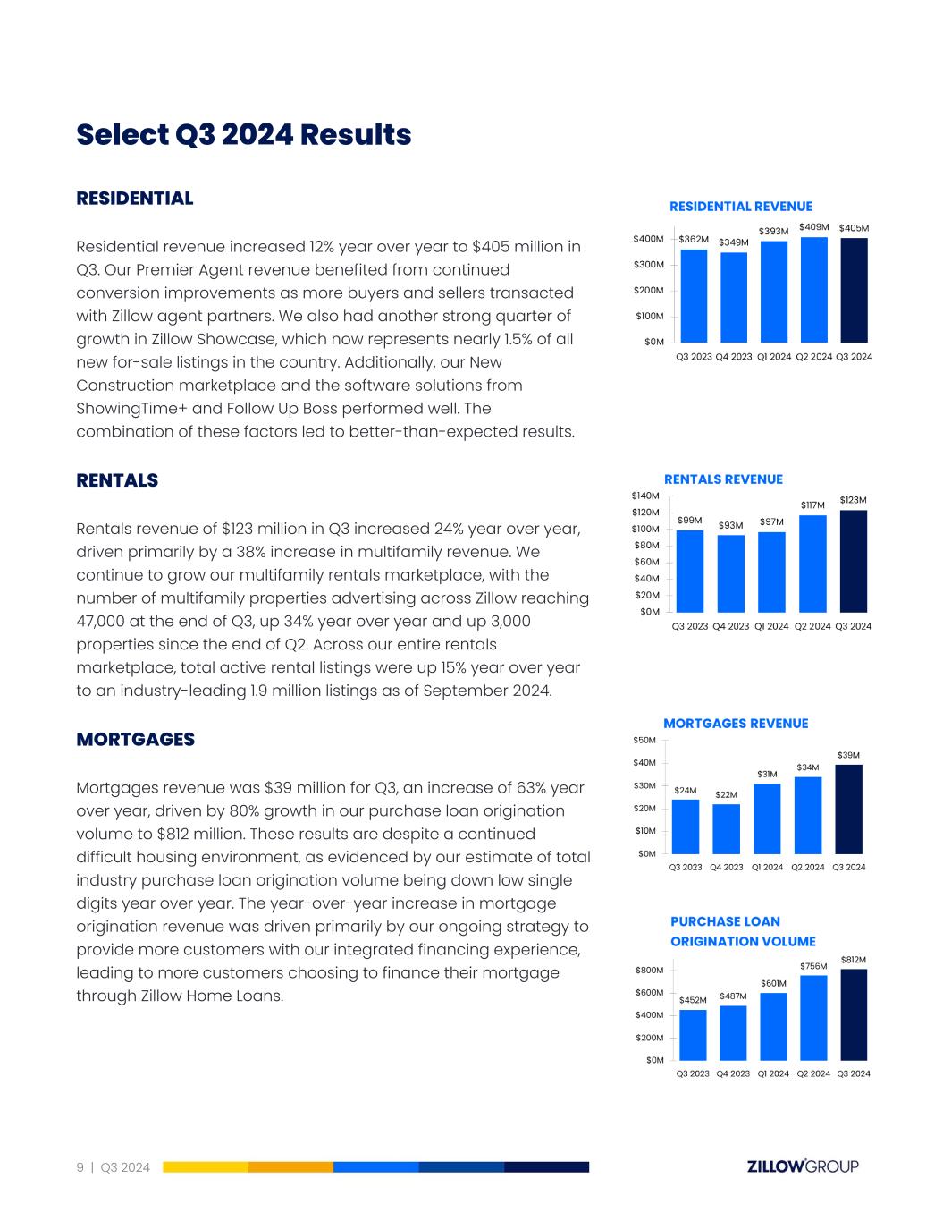 SelectQ3 2024Results RESIDENTIAL Residential revenue increased 12% year over year to $405 million in Q3. Our Premier Agent revenue benefited from continued conversion improvements as more buyers and sellers transacted with Zillow agent partners. We also had another strong quarter of growth in Zillow Showcase, which now represents nearly 1.5% of all new for-sale listings in the country. Additionally, our New Construction marketplace and the software solutions from ShowingTime+ and Follow Up Boss performed well. The combination of these factors led to better-than-expected results. RENTALS Rentals revenue of $123 million in Q3 increased 24% year over year, driven primarily by a 38% increase in multifamily revenue. We continue to grow our multifamily rentals marketplace, with the number of multifamily properties advertising across Zillow reaching 47,000 at the end of Q3, up 34% year over year and up 3,000 properties since the end of Q2. Across our entire rentals marketplace, total active rental listings were up 15% year over year to an industry-leading 1.9 million listings as of September 2024. MORTGAGES Mortgages revenue was $39 million for Q3, an increase of 63% year over year, driven by 80% growth in our purchase loan origination volume to $812 million. These results are despite a continued difficult housing environment, as evidenced by our estimate of total industry purchase loan origination volume being down low single digits year over year. The year-over-year increase in mortgage origination revenue was driven primarily by our ongoing strategy to provide more customers with our integrated financing experience, leading to more customers choosing to finance their mortgage through Zillow Home Loans. 9 | Q3 2024
