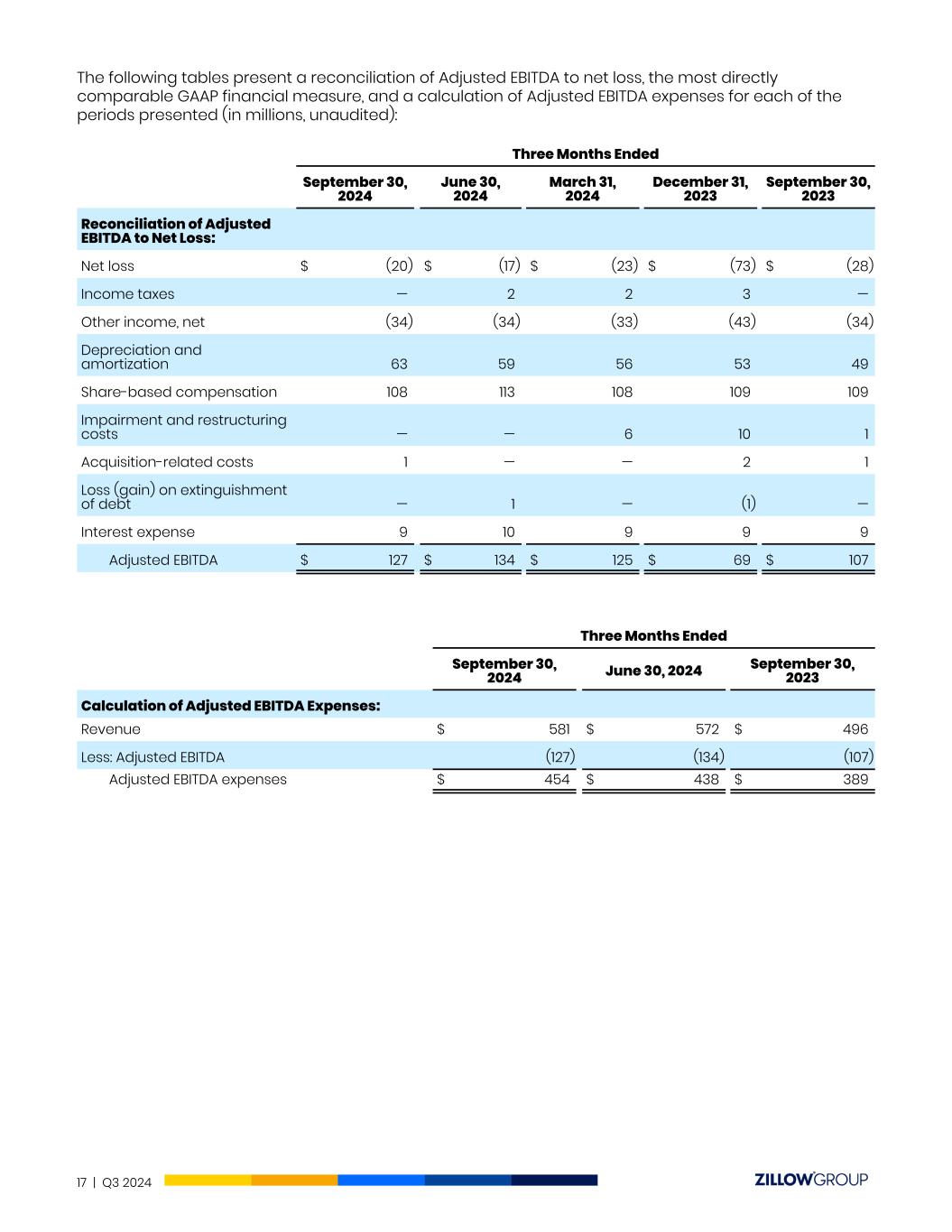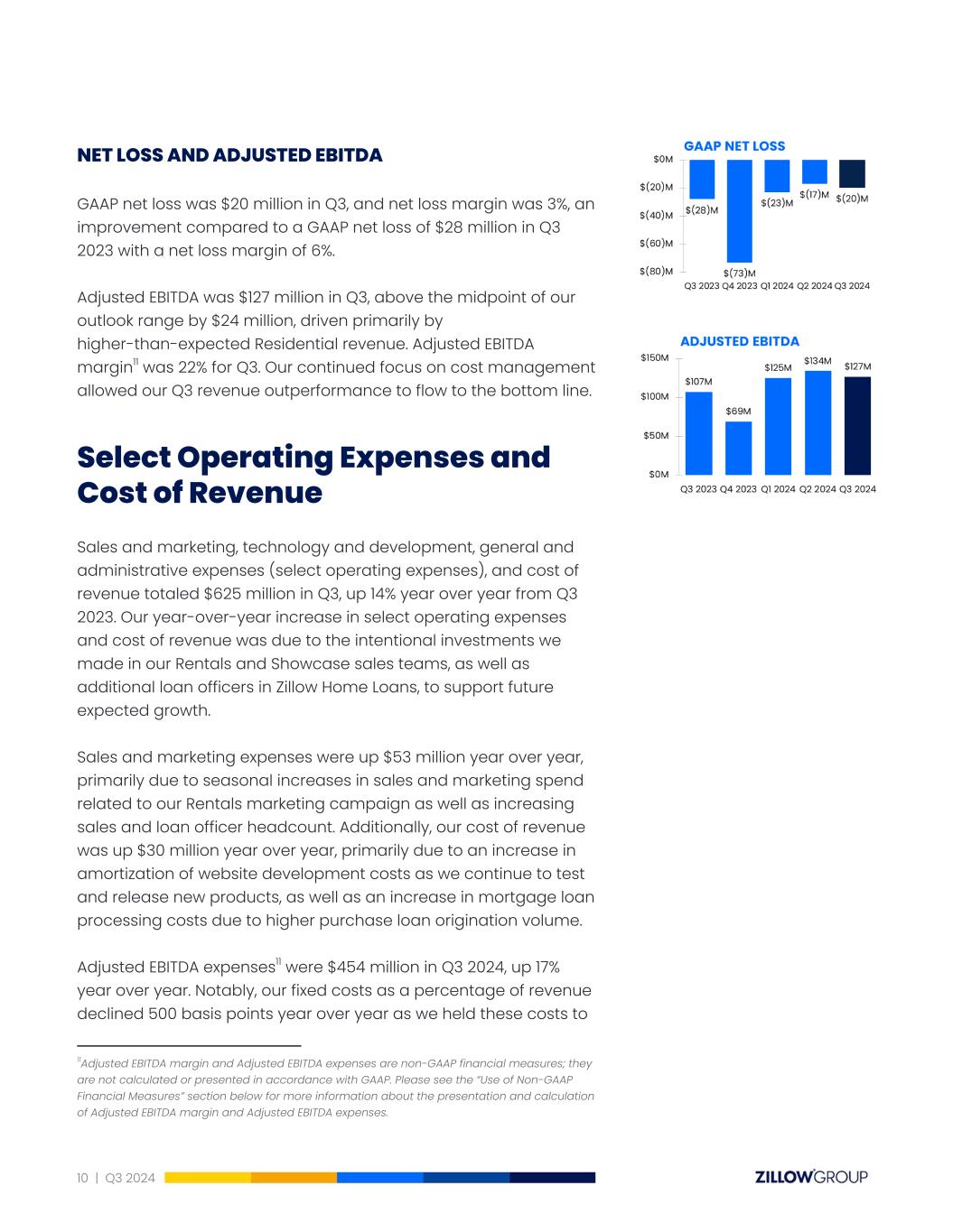 NET LOSSANDADJUSTED EBITDA GAAP net loss was $20 million in Q3, and net loss margin was 3%, an improvement compared to a GAAP net loss of $28 million in Q3 2023 with a net loss margin of 6%. Adjusted EBITDA was $127 million in Q3, above the midpoint of our outlook range by $24 million, driven primarily by higher-than-expected Residential revenue. Adjusted EBITDA margin11 was 22% for Q3. Our continued focus on cost management allowed our Q3 revenue outperformance to flow to the bottom line. SelectOperating Expenses and Cost of Revenue Sales and marketing, technology and development, general and administrative expenses (select operating expenses), and cost of revenue totaled $625 million in Q3, up 14% year over year from Q3 2023. Our year-over-year increase in select operating expenses and cost of revenue was due to the intentional investments we made in our Rentals and Showcase sales teams, as well as additional loan officers in Zillow Home Loans, to support future expected growth. Sales and marketing expenses were up $53 million year over year, primarily due to seasonal increases in sales and marketing spend related to our Rentals marketing campaign as well as increasing sales and loan officer headcount. Additionally, our cost of revenue was up $30 million year over year, primarily due to an increase in amortization of website development costs as we continue to test and release new products, as well as an increase in mortgage loan processing costs due to higher purchase loan origination volume. Adjusted EBITDA expenses11 were $454 million in Q3 2024, up 17% year over year. Notably, our fixed costs as a percentage of revenue declined 500 basis points year over year as we held these costs to 11Adjusted EBITDA margin and Adjusted EBITDA expenses are non-GAAP financial measures; they are not calculated or presented in accordance with GAAP. Please see the “Use of Non-GAAP Financial Measures” section below for more information about the presentation and calculation of Adjusted EBITDA margin and Adjusted EBITDA expenses. 10 | Q3 2024
