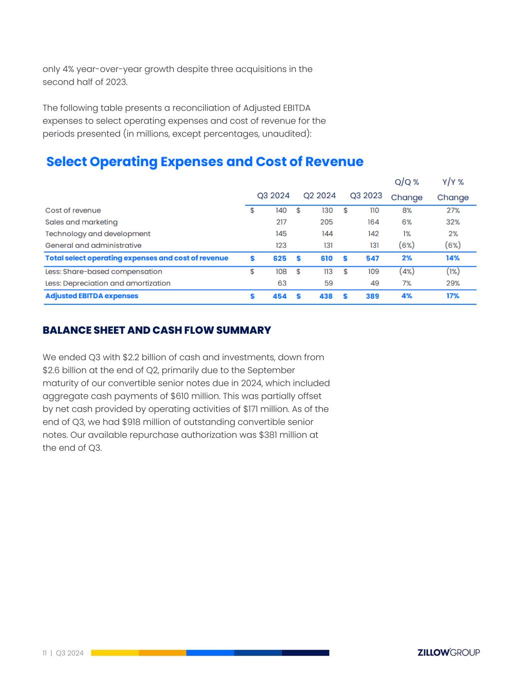 only 4% year-over-year growth despite three acquisitions in the second half of 2023. The following table presents a reconciliation of Adjusted EBITDA expenses to select operating expenses and cost of revenue for the periods presented (in millions, except percentages, unaudited): BALANCE SHEETANDCASHFLOWSUMMARY We ended Q3 with $2.2 billion of cash and investments, down from $2.6 billion at the end of Q2, primarily due to the September maturity of our convertible senior notes due in 2024, which included aggregate cash payments of $610 million. This was partially offset by net cash provided by operating activities of $171 million. As of the end of Q3, we had $918 million of outstanding convertible senior notes. Our available repurchase authorization was $381 million at the end of Q3. 11 | Q3 2024