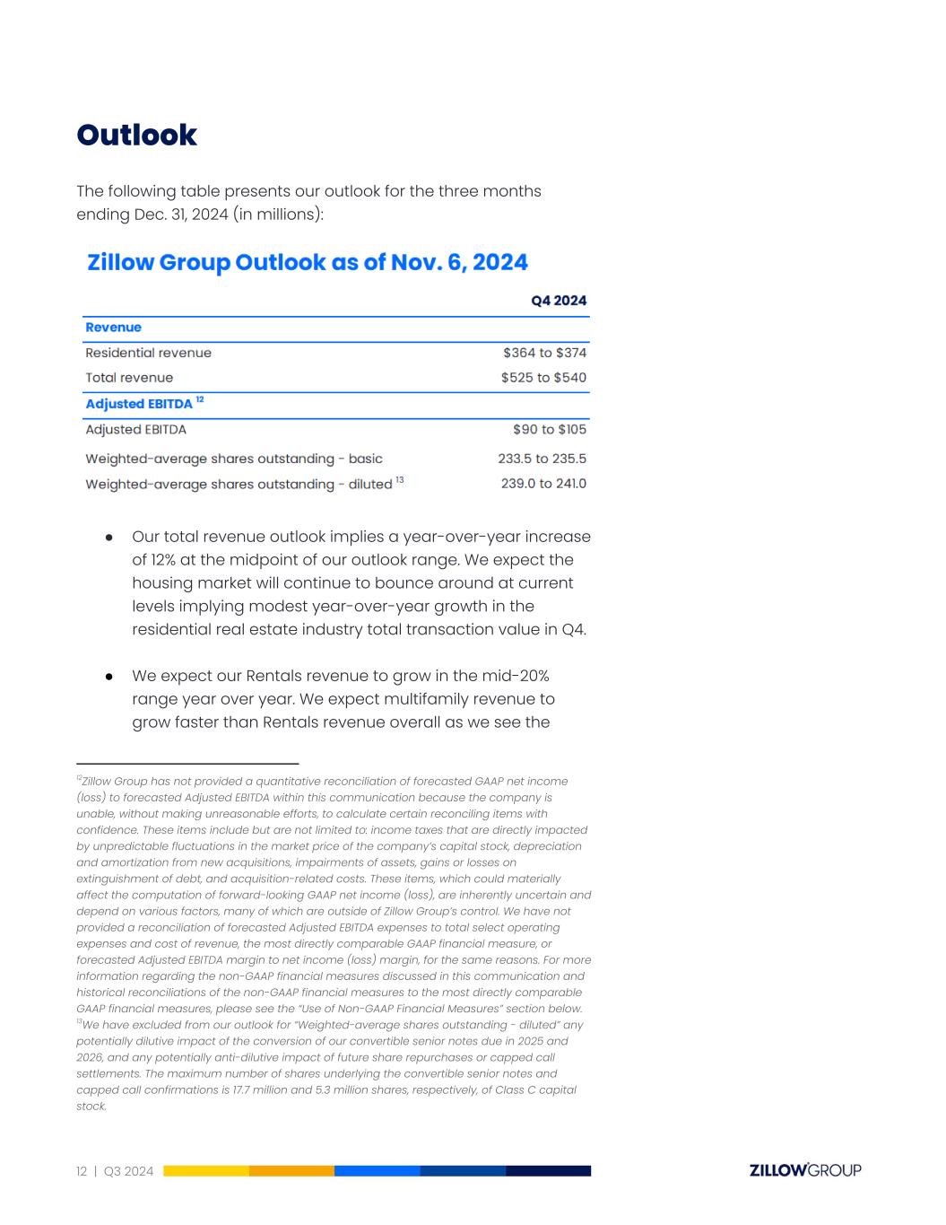 Outlook The following table presents our outlook for the three months ending Dec. 31, 2024 (in millions): 1213 ● Our total revenue outlook implies a year-over-year increase of 12% at the midpoint of our outlook range. We expect the housing market will continue to bounce around at current levels implying modest year-over-year growth in the residential real estate industry total transaction value in Q4. ● We expect our Rentals revenue to grow in the mid-20% range year over year. We expect multifamily revenue to grow faster than Rentals revenue overall as we see the 13We have excluded from our outlook for “Weighted-average shares outstanding - diluted” any potentially dilutive impact of the conversion of our convertible senior notes due in 2025 and 2026, and any potentially anti-dilutive impact of future share repurchases or capped call settlements. The maximum number of shares underlying the convertible senior notes and capped call confirmations is 17.7 million and 5.3 million shares, respectively, of Class C capital stock. 12Zillow Group has not provided a quantitative reconciliation of forecasted GAAP net income (loss) to forecasted Adjusted EBITDA within this communication because the company is unable, without making unreasonable efforts, to calculate certain reconciling items with confidence. These items include but are not limited to: income taxes that are directly impacted by unpredictable fluctuations in the market price of the company’s capital stock, depreciation and amortization from new acquisitions, impairments of assets, gains or losses on extinguishment of debt, and acquisition-related costs. These items, which could materially affect the computation of forward-looking GAAP net income (loss), are inherently uncertain and depend on various factors, many of which are outside of Zillow Group’s control. We have not provided a reconciliation of forecasted Adjusted EBITDA expenses to total select operating expenses and cost of revenue, the most directly comparable GAAP financial measure, or forecasted Adjusted EBITDA margin to net income (loss) margin, for the same reasons. For more information regarding the non-GAAP financial measures discussed in this communication and historical reconciliations of the non-GAAP financial measures to the most directly comparable GAAP financial measures, please see the “Use of Non-GAAP Financial Measures” section below. 12 | Q3 2024