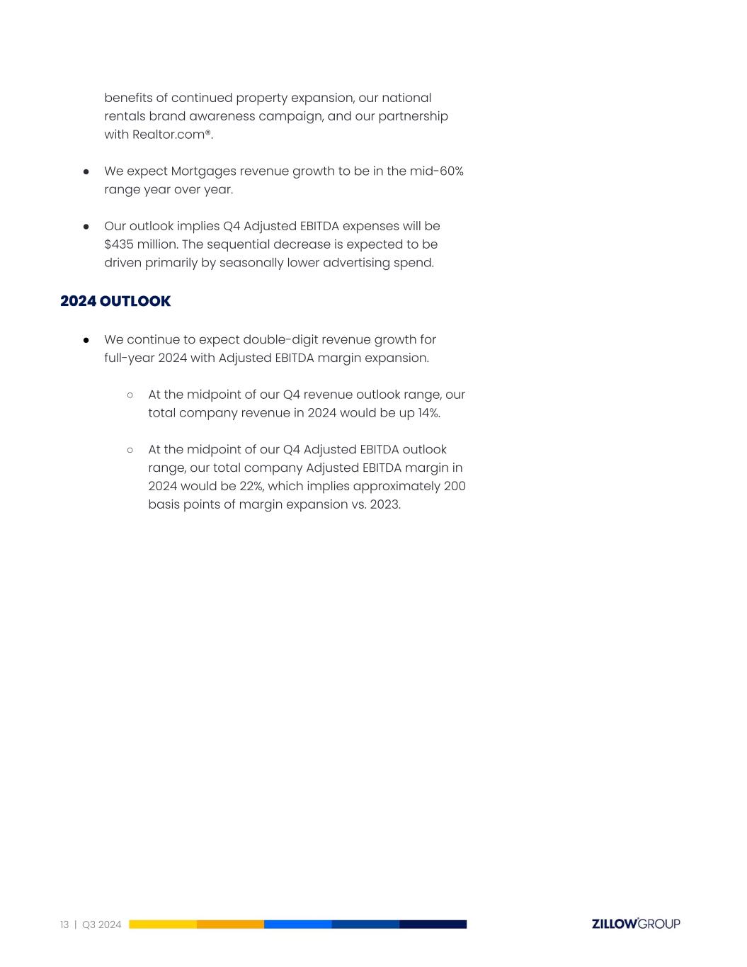 benefits of continued property expansion, our national rentals brand awareness campaign, and our partnership with Realtor.com®. ● We expect Mortgages revenue growth to be in the mid-60% range year over year. ● Our outlook implies Q4 Adjusted EBITDA expenses will be $435 million. The sequential decrease is expected to be driven primarily by seasonally lower advertising spend. 2024OUTLOOK ● We continue to expect double-digit revenue growth for full-year 2024 with Adjusted EBITDA margin expansion. ○ At the midpoint of our Q4 revenue outlook range, our total company revenue in 2024 would be up 14%. ○ At the midpoint of our Q4 Adjusted EBITDA outlook range, our total company Adjusted EBITDA margin in 2024 would be 22%, which implies approximately 200 basis points of margin expansion vs. 2023. 13 | Q3 2024
