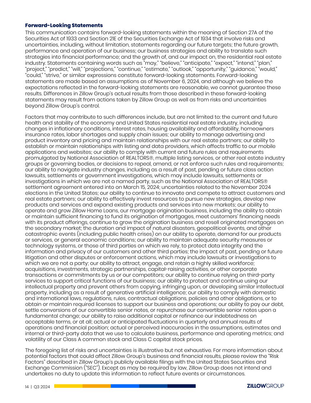 Forward-Looking Statements This communication contains forward-looking statements within the meaning of Section 27A of the Securities Act of 1933 and Section 21E of the Securities Exchange Act of 1934 that involve risks and uncertainties, including, without limitation, statements regarding our future targets; the future growth, performance and operation of our business; our business strategies and ability to translate such strategies into financial performance; and the growth of, and our impact on, the residential real estate industry. Statements containing words such as “may,” “believe,” “anticipate,” “expect,” “intend,” “plan,” “project,” “predict,” “will,” “projections,” “continue,” “estimate,” “outlook,” “opportunity,” “guidance,” “would,” “could,” “strive,” or similar expressions constitute forward-looking statements. Forward-looking statements are made based on assumptions as of November 6, 2024, and although we believe the expectations reflected in the forward-looking statements are reasonable, we cannot guarantee these results. Differences in Zillow Group’s actual results from those described in these forward-looking statements may result from actions taken by Zillow Group as well as from risks and uncertainties beyond Zillow Group’s control. Factors that may contribute to such differences include, but are not limited to: the current and future health and stability of the economy and United States residential real estate industry, including changes in inflationary conditions, interest rates, housing availability and affordability, homeowners insurance rates, labor shortages and supply chain issues; our ability to manage advertising and product inventory and pricing and maintain relationships with our real estate partners; our ability to establish or maintain relationships with listing and data providers, which affects traffic to our mobile applications and websites; our ability to comply with current and future rules and requirements promulgated by National Association of REALTORS®, multiple listing services, or other real estate industry groups or governing bodies, or decisions to repeal, amend, or not enforce such rules and requirements; our ability to navigate industry changes, including as a result of past, pending or future class action lawsuits, settlements or government investigations, which may include lawsuits, settlements or investigations in which we are not a named party, such as the National Association of REALTORS® settlement agreement entered into on March 15, 2024; uncertainties related to the November 2024 elections in the United States; our ability to continue to innovate and compete to attract customers and real estate partners; our ability to effectively invest resources to pursue new strategies, develop new products and services and expand existing products and services into new markets; our ability to operate and grow Zillow Home Loans, our mortgage origination business, including the ability to obtain or maintain sufficient financing to fund its origination of mortgages, meet customers’ financing needs with its product offerings, continue to grow the origination business and resell originated mortgages on the secondary market; the duration and impact of natural disasters, geopolitical events, and other catastrophic events (including public health crises) on our ability to operate, demand for our products or services, or general economic conditions; our ability to maintain adequate security measures or technology systems, or those of third parties on which we rely, to protect data integrity and the information and privacy of our customers and other third parties; the impact of past, pending or future litigation and other disputes or enforcement actions, which may include lawsuits or investigations to which we are not a party; our ability to attract, engage, and retain a highly skilled workforce; acquisitions, investments, strategic partnerships, capital-raising activities, or other corporate transactions or commitments by us or our competitors; our ability to continue relying on third-party services to support critical functions of our business; our ability to protect and continue using our intellectual property and prevent others from copying, infringing upon, or developing similar intellectual property, including as a result of generative artificial intelligence; our ability to comply with domestic and international laws, regulations, rules, contractual obligations, policies and other obligations, or to obtain or maintain required licenses to support our business and operations; our ability to pay our debt, settle conversions of our convertible senior notes, or repurchase our convertible senior notes upon a fundamental change; our ability to raise additional capital or refinance our indebtedness on acceptable terms, or at all; actual or anticipated fluctuations in quarterly and annual results of operations and financial position; actual or perceived inaccuracies in the assumptions, estimates and internal or third-party data that we use to calculate business, performance and operating metrics; and volatility of our Class A common stock and Class C capital stock prices. The foregoing list of risks and uncertainties is illustrative but not exhaustive. For more information about potential factors that could affect Zillow Group’s business and financial results, please review the “Risk Factors” described in Zillow Group’s publicly available filings with the United States Securities and Exchange Commission (“SEC”). Except as may be required by law, Zillow Group does not intend and undertakes no duty to update this information to reflect future events or circumstances. 14 | Q3 2024