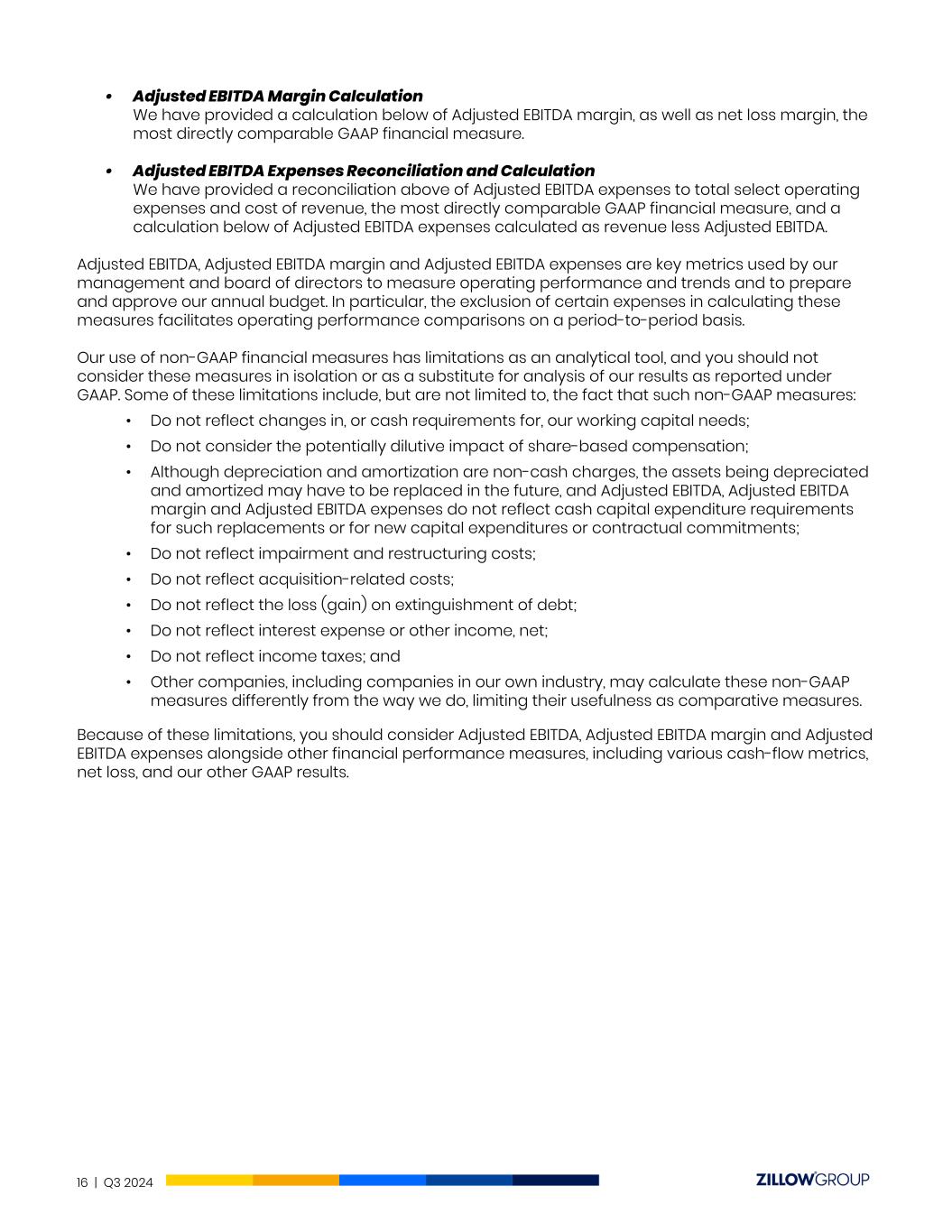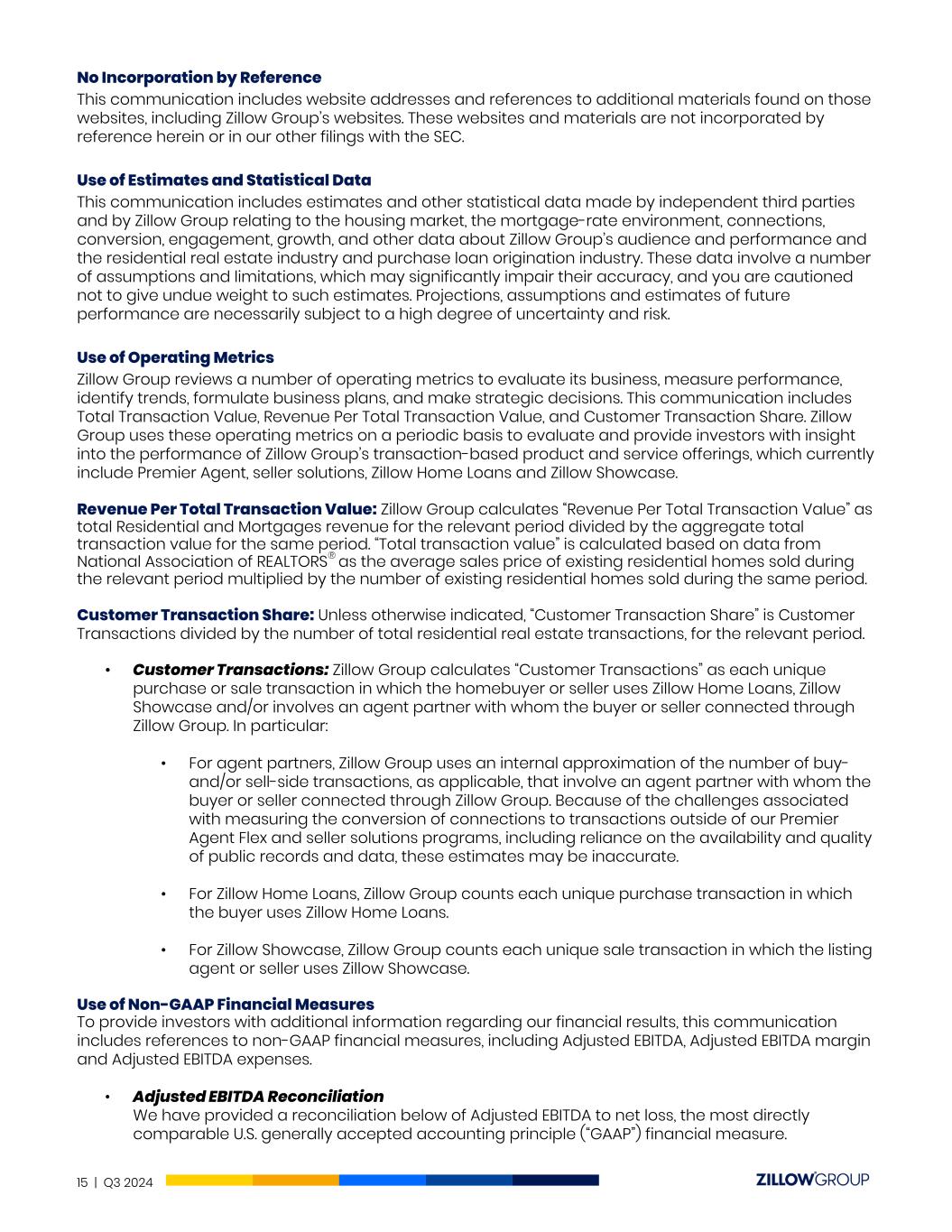 No Incorporation by Reference This communication includes website addresses and references to additional materials found on those websites, including Zillow Group’s websites. These websites and materials are not incorporated by reference herein or in our other filings with the SEC. Use of Estimates and Statistical Data This communication includes estimates and other statistical data made by independent third parties and by Zillow Group relating to the housing market, the mortgage-rate environment, connections, conversion, engagement, growth, and other data about Zillow Group’s audience and performance and the residential real estate industry and purchase loan origination industry. These data involve a number of assumptions and limitations, which may significantly impair their accuracy, and you are cautioned not to give undue weight to such estimates. Projections, assumptions and estimates of future performance are necessarily subject to a high degree of uncertainty and risk. Use of Operating Metrics Zillow Group reviews a number of operating metrics to evaluate its business, measure performance, identify trends, formulate business plans, and make strategic decisions. This communication includes Total Transaction Value, Revenue Per Total Transaction Value, and Customer Transaction Share. Zillow Group uses these operating metrics on a periodic basis to evaluate and provide investors with insight into the performance of Zillow Group’s transaction-based product and service offerings, which currently include Premier Agent, seller solutions, Zillow Home Loans and Zillow Showcase. Revenue Per Total Transaction Value: Zillow Group calculates “Revenue Per Total Transaction Value” as total Residential and Mortgages revenue for the relevant period divided by the aggregate total transaction value for the same period. “Total transaction value” is calculated based on data from National Association of REALTORS® as the average sales price of existing residential homes sold during the relevant period multiplied by the number of existing residential homes sold during the same period. Customer Transaction Share: Unless otherwise indicated, “Customer Transaction Share” is Customer Transactions divided by the number of total residential real estate transactions, for the relevant period. • Customer Transactions: Zillow Group calculates “Customer Transactions” as each unique purchase or sale transaction in which the homebuyer or seller uses Zillow Home Loans, Zillow Showcase and/or involves an agent partner with whom the buyer or seller connected through Zillow Group. In particular: • For agent partners, Zillow Group uses an internal approximation of the number of buy- and/or sell-side transactions, as applicable, that involve an agent partner with whom the buyer or seller connected through Zillow Group. Because of the challenges associated with measuring the conversion of connections to transactions outside of our Premier Agent Flex and seller solutions programs, including reliance on the availability and quality of public records and data, these estimates may be inaccurate. • For Zillow Home Loans, Zillow Group counts each unique purchase transaction in which the buyer uses Zillow Home Loans. • For Zillow Showcase, Zillow Group counts each unique sale transaction in which the listing agent or seller uses Zillow Showcase. Use of Non-GAAP Financial Measures To provide investors with additional information regarding our financial results, this communication includes references to non-GAAP financial measures, including Adjusted EBITDA, Adjusted EBITDA margin and Adjusted EBITDA expenses. • Adjusted EBITDA Reconciliation We have provided a reconciliation below of Adjusted EBITDA to net loss, the most directly comparable U.S. generally accepted accounting principle (“GAAP”) financial measure. 15 | Q3 2024
