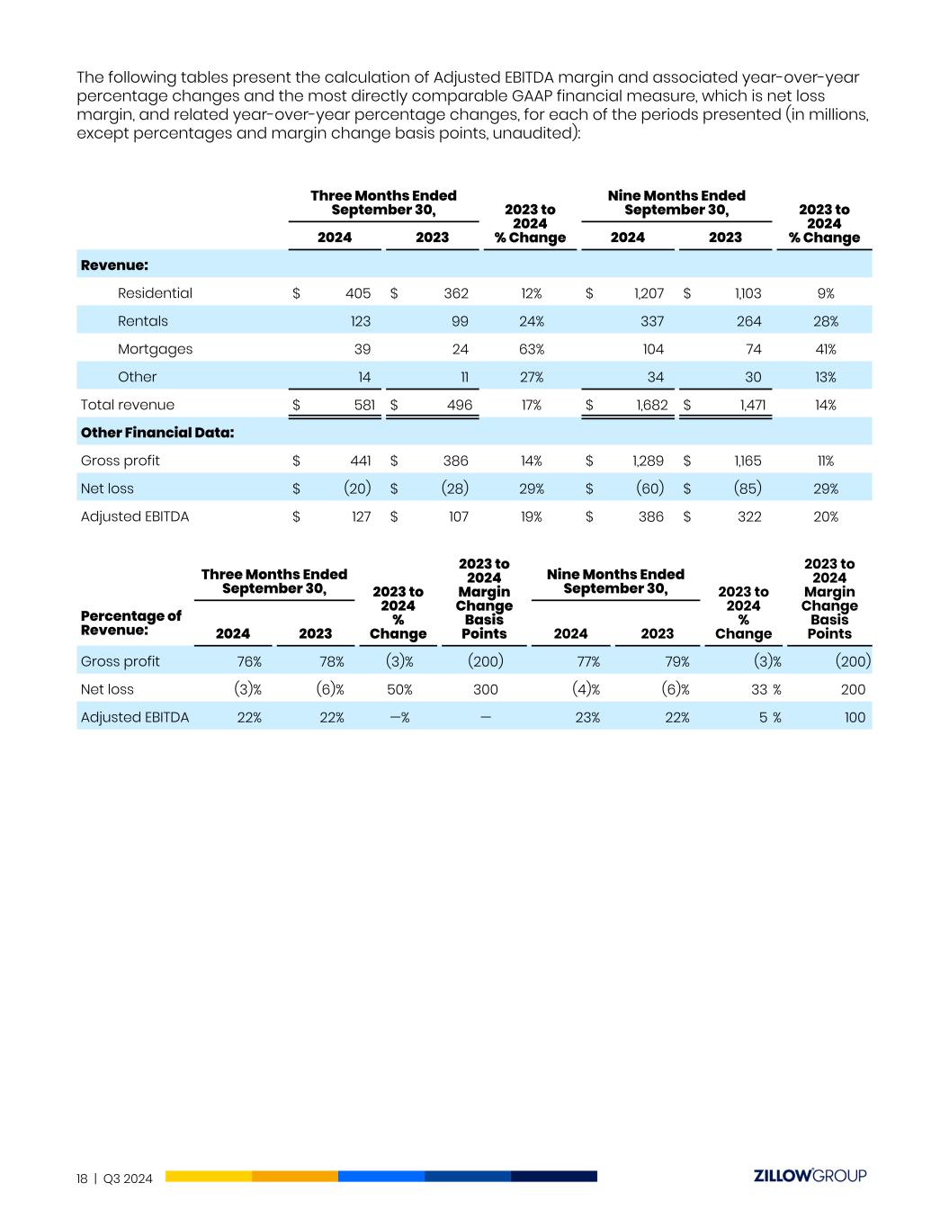 The following tables present the calculation of Adjusted EBITDA margin and associated year-over-year percentage changes and the most directly comparable GAAP financial measure, which is net loss margin, and related year-over-year percentage changes, for each of the periods presented (in millions, except percentages and margin change basis points, unaudited): Three Months Ended September 30, 2023 to 2024 % Change Nine Months Ended September 30, 2023 to 2024 % Change2024 2023 2024 2023 Revenue: Residential $ 405 $ 362 12% $ 1,207 $ 1,103 9% Rentals 123 99 24% 337 264 28% Mortgages 39 24 63% 104 74 41% Other 14 11 27% 34 30 13% Total revenue $ 581 $ 496 17% $ 1,682 $ 1,471 14% Other Financial Data: Gross profit $ 441 $ 386 14% $ 1,289 $ 1,165 11% Net loss $ (20) $ (28) 29% $ (60) $ (85) 29% Adjusted EBITDA $ 127 $ 107 19% $ 386 $ 322 20% Three Months Ended September 30, 2023 to 2024 % Change 2023 to 2024 Margin Change Basis Points Nine Months Ended September 30, 2023 to 2024 % Change 2023 to 2024 Margin Change Basis Points Percentage of Revenue: 2024 2023 2024 2023 Gross profit 76 % 78 % (3)% (200) 77 % 79 % (3) % (200) Net loss (3) % (6) % 50% 300 (4) % (6) % 33 % 200 Adjusted EBITDA 22 % 22 % —% — 23 % 22 % 5 % 100 18 | Q3 2024