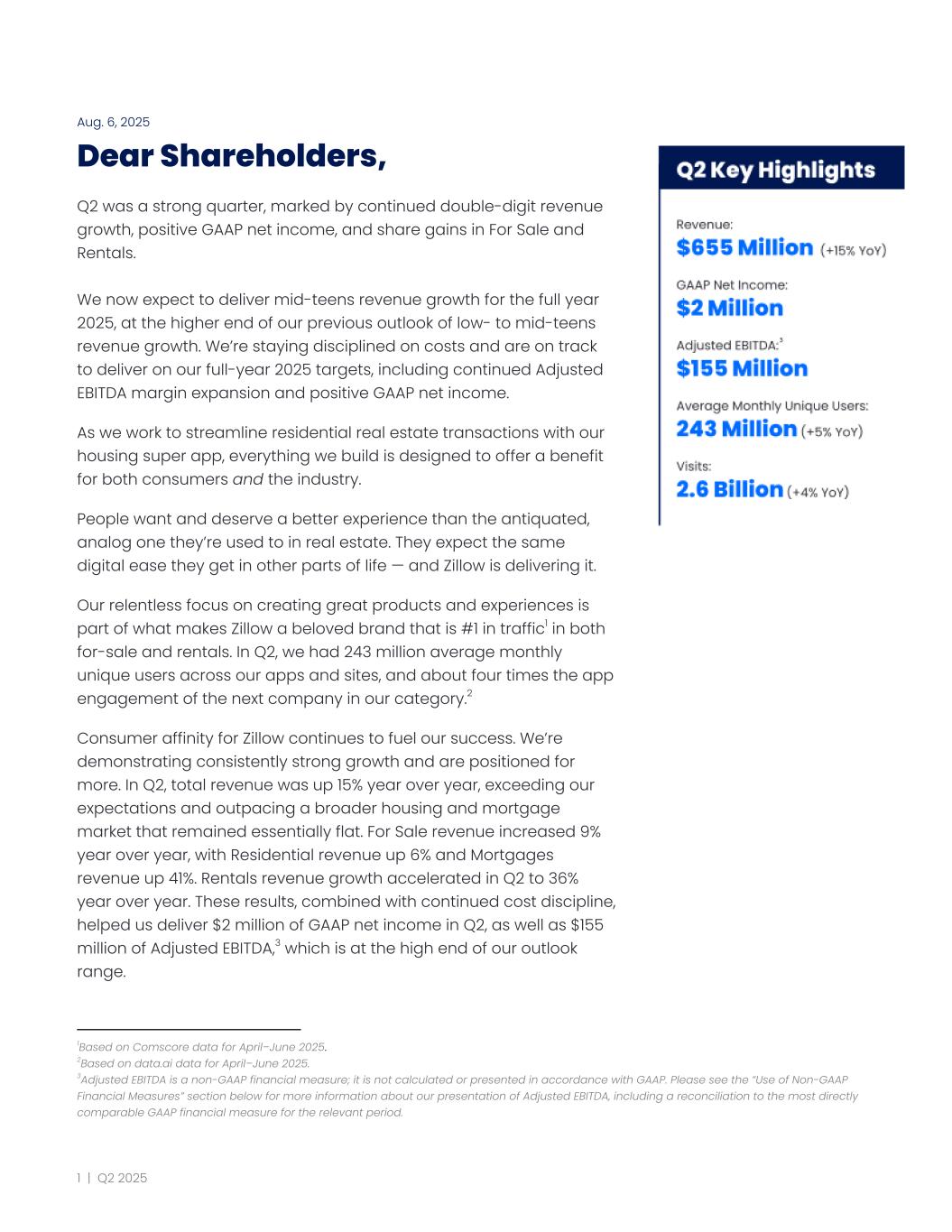 Aug. 6, 2025 Dear Shareholders, Q2 was a strong quarter, marked by continued double-digit revenue growth, positive GAAP net income, and share gains in For Sale and Rentals. We now expect to deliver mid-teens revenue growth for the full year 2025, at the higher end of our previous outlook of low- to mid-teens revenue growth. We’re staying disciplined on costs and are on track to deliver on our full-year 2025 targets, including continued Adjusted EBITDA margin expansion and positive GAAP net income. As we work to streamline residential real estate transactions with our housing super app, everything we build is designed to offer a benefit for both consumers and the industry. People want and deserve a better experience than the antiquated, analog one they’re used to in real estate. They expect the same digital ease they get in other parts of life — and Zillow is delivering it. Our relentless focus on creating great products and experiences is part of what makes Zillow a beloved brand that is #1 in traffic1 in both for-sale and rentals. In Q2, we had 243 million average monthly unique users across our apps and sites, and about four times the app engagement of the next company in our category.2 Consumer affinity for Zillow continues to fuel our success. We’re demonstrating consistently strong growth and are positioned for more. In Q2, total revenue was up 15% year over year, exceeding our expectations and outpacing a broader housing and mortgage market that remained essentially flat. For Sale revenue increased 9% year over year, with Residential revenue up 6% and Mortgages revenue up 41%. Rentals revenue growth accelerated in Q2 to 36% year over year. These results, combined with continued cost discipline, helped us deliver $2 million of GAAP net income in Q2, as well as $155 million of Adjusted EBITDA,3 which is at the high end of our outlook range. 3Adjusted EBITDA is a non-GAAP financial measure; it is not calculated or presented in accordance with GAAP. Please see the “Use of Non-GAAP Financial Measures” section below for more information about our presentation of Adjusted EBITDA, including a reconciliation to the most directly comparable GAAP financial measure for the relevant period. 2Based on data.ai data for April–June 2025. 1Based on Comscore data for April–June 2025. 1 | Q2 2025