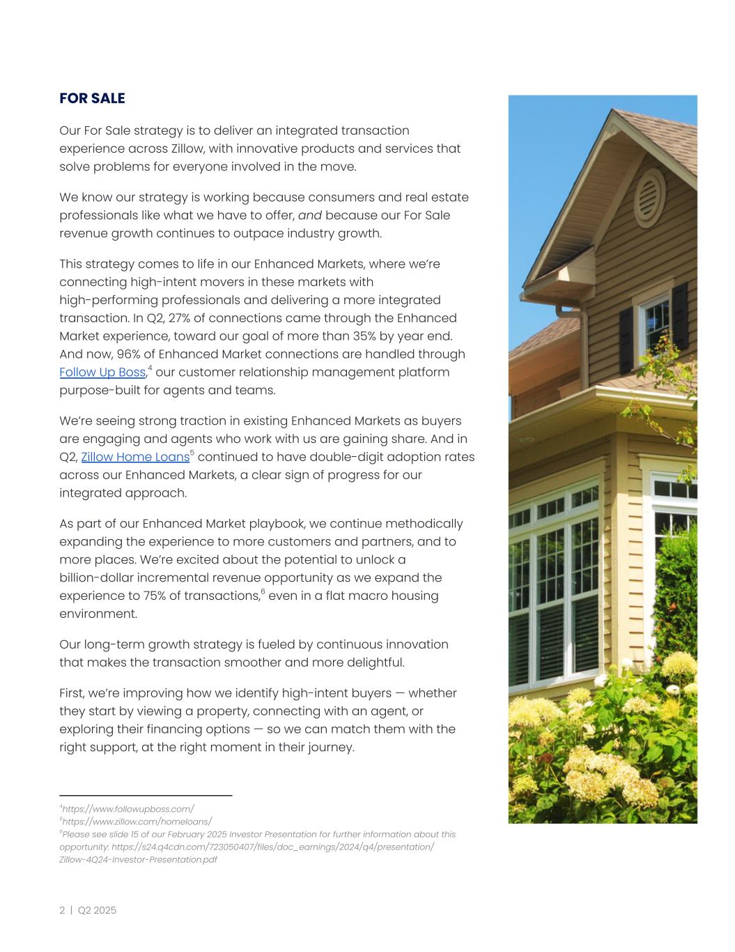 FOR SALE Our For Sale strategy is to deliver an integrated transaction experience across Zillow, with innovative products and services that solve problems for everyone involved in the move. We know our strategy is working because consumers and real estate professionals like what we have to offer, and because our For Sale revenue growth continues to outpace industry growth. This strategy comes to life in our Enhanced Markets, where we’re connecting high-intent movers in these markets with high-performing professionals and delivering a more integrated transaction. In Q2, 27% of connections came through the Enhanced Market experience, toward our goal of more than 35% by year end. And now, 96% of Enhanced Market connections are handled through Follow Up Boss,4 our customer relationship management platform purpose-built for agents and teams. We’re seeing strong traction in existing Enhanced Markets as buyers are engaging and agents who work with us are gaining share. And in Q2, Zillow Home Loans5 continued to have double-digit adoption rates across our Enhanced Markets, a clear sign of progress for our integrated approach. As part of our Enhanced Market playbook, we continue methodically expanding the experience to more customers and partners, and to more places. We’re excited about the potential to unlock a billion-dollar incremental revenue opportunity as we expand the experience to 75% of transactions,6 even in a flat macro housing environment. Our long-term growth strategy is fueled by continuous innovation that makes the transaction smoother and more delightful. First, we’re improving how we identify high-intent buyers — whether they start by viewing a property, connecting with an agent, or exploring their financing options — so we can match them with the right support, at the right moment in their journey. 6Please see slide 15 of our February 2025 Investor Presentation for further information about this opportunity: https://s24.q4cdn.com/723050407/files/doc_earnings/2024/q4/presentation/ Zillow-4Q24-Investor-Presentation.pdf 5https://www.zillow.com/homeloans/ 4https://www.followupboss.com/ 2 | Q2 2025