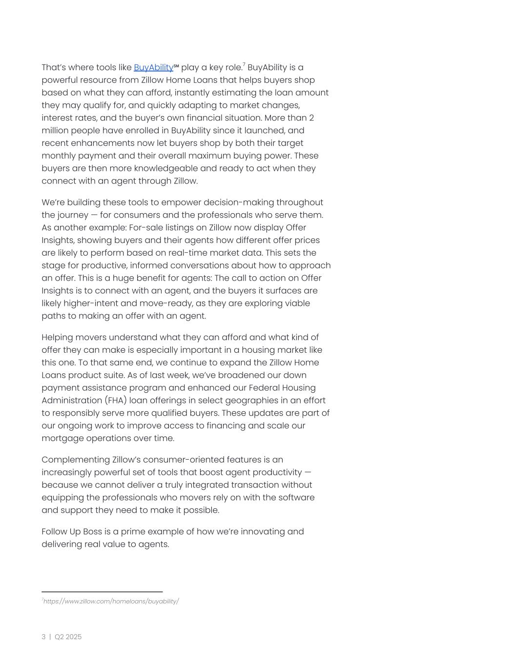 That’s where tools like BuyAbility℠ play a key role.7 BuyAbility is a powerful resource from Zillow Home Loans that helps buyers shop based on what they can afford, instantly estimating the loan amount they may qualify for, and quickly adapting to market changes, interest rates, and the buyer’s own financial situation. More than 2 million people have enrolled in BuyAbility since it launched, and recent enhancements now let buyers shop by both their target monthly payment and their overall maximum buying power. These buyers are then more knowledgeable and ready to act when they connect with an agent through Zillow. We’re building these tools to empower decision-making throughout the journey — for consumers and the professionals who serve them. As another example: For-sale listings on Zillow now display Offer Insights, showing buyers and their agents how different offer prices are likely to perform based on real-time market data. This sets the stage for productive, informed conversations about how to approach an offer. This is a huge benefit for agents: The call to action on Offer Insights is to connect with an agent, and the buyers it surfaces are likely higher-intent and move-ready, as they are exploring viable paths to making an offer with an agent. Helping movers understand what they can afford and what kind of offer they can make is especially important in a housing market like this one. To that same end, we continue to expand the Zillow Home Loans product suite. As of last week, we’ve broadened our down payment assistance program and enhanced our Federal Housing Administration (FHA) loan offerings in select geographies in an effort to responsibly serve more qualified buyers. These updates are part of our ongoing work to improve access to financing and scale our mortgage operations over time. Complementing Zillow’s consumer-oriented features is an increasingly powerful set of tools that boost agent productivity — because we cannot deliver a truly integrated transaction without equipping the professionals who movers rely on with the software and support they need to make it possible. Follow Up Boss is a prime example of how we’re innovating and delivering real value to agents. 7https://www.zillow.com/homeloans/buyability/ 3 | Q2 2025