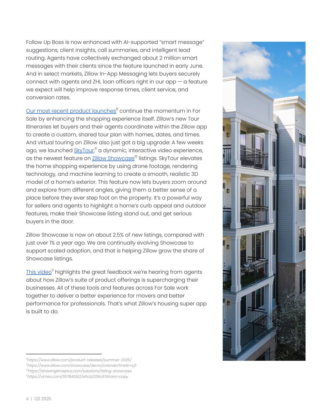 Follow Up Boss is now enhanced with AI-supported “smart message” suggestions, client insights, call summaries, and intelligent lead routing. Agents have collectively exchanged about 2 million smart messages with their clients since the feature launched in early June. And in select markets, Zillow In-App Messaging lets buyers securely connect with agents and ZHL loan officers right in our app — a feature we expect will help improve response times, client service, and conversion rates. Our most recent product launches8 continue the momentum in For Sale by enhancing the shopping experience itself. Zillow’s new Tour Itineraries let buyers and their agents coordinate within the Zillow app to create a custom, shared tour plan with homes, dates, and times. And virtual touring on Zillow also just got a big upgrade: A few weeks ago, we launched SkyTour,9 a dynamic, interactive video experience, as the newest feature on Zillow Showcase10 listings. SkyTour elevates the home shopping experience by using drone footage, rendering technology, and machine learning to create a smooth, realistic 3D model of a home’s exterior. This feature now lets buyers zoom around and explore from different angles, giving them a better sense of a place before they ever step foot on the property. It’s a powerful way for sellers and agents to highlight a home’s curb appeal and outdoor features, make their Showcase listing stand out, and get serious buyers in the door. Zillow Showcase is now on about 2.5% of new listings, compared with just over 1% a year ago. We are continually evolving Showcase to support scaled adoption, and that is helping Zillow grow the share of Showcase listings. This video11 highlights the great feedback we’re hearing from agents about how Zillow’s suite of product offerings is supercharging their businesses. All of these tools and features across For Sale work together to deliver a better experience for movers and better performance for professionals. That’s what Zillow’s housing super app is built to do. 11https://vimeo.com/1107841062/e5cb2126c6?share=copy 10https://showingtimeplus.com/solutions/listing-showcase 9https://www.zillow.com/showcase/demo/orlando?imxlb=s,0 8https://www.zillow.com/product-releases/summer-2025/ 4 | Q2 2025