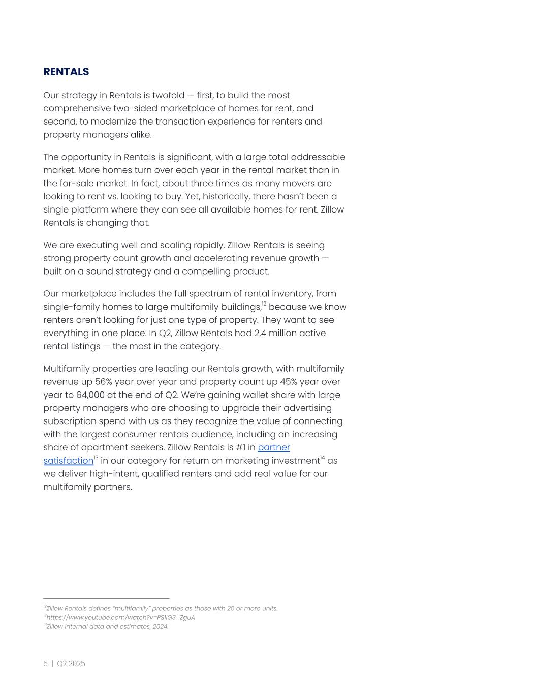 RENTALS Our strategy in Rentals is twofold — first, to build the most comprehensive two-sided marketplace of homes for rent, and second, to modernize the transaction experience for renters and property managers alike. The opportunity in Rentals is significant, with a large total addressable market. More homes turn over each year in the rental market than in the for-sale market. In fact, about three times as many movers are looking to rent vs. looking to buy. Yet, historically, there hasn’t been a single platform where they can see all available homes for rent. Zillow Rentals is changing that. We are executing well and scaling rapidly. Zillow Rentals is seeing strong property count growth and accelerating revenue growth — built on a sound strategy and a compelling product. Our marketplace includes the full spectrum of rental inventory, from single-family homes to large multifamily buildings,12 because we know renters aren’t looking for just one type of property. They want to see everything in one place. In Q2, Zillow Rentals had 2.4 million active rental listings — the most in the category. Multifamily properties are leading our Rentals growth, with multifamily revenue up 56% year over year and property count up 45% year over year to 64,000 at the end of Q2. We’re gaining wallet share with large property managers who are choosing to upgrade their advertising subscription spend with us as they recognize the value of connecting with the largest consumer rentals audience, including an increasing share of apartment seekers. Zillow Rentals is #1 in partner satisfaction13 in our category for return on marketing investment14 as we deliver high-intent, qualified renters and add real value for our multifamily partners. 14Zillow internal data and estimates, 2024. 13https://www.youtube.com/watch?v=PS1iG3_ZguA 12Zillow Rentals defines “multifamily” properties as those with 25 or more units. 5 | Q2 2025