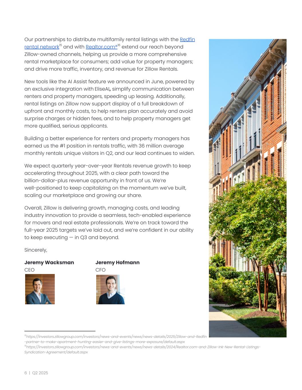 Our partnerships to distribute multifamily rental listings with the Redfin rental network15 and with Realtor.com®16 extend our reach beyond Zillow-owned channels, helping us provide a more comprehensive rental marketplace for consumers; add value for property managers; and drive more traffic, inventory, and revenue for Zillow Rentals. New tools like the AI Assist feature we announced in June, powered by an exclusive integration with EliseAI, simplify communication between renters and property managers, speeding up leasing. Additionally, rental listings on Zillow now support display of a full breakdown of upfront and monthly costs, to help renters plan accurately and avoid surprise charges or hidden fees, and to help property managers get more qualified, serious applicants. Building a better experience for renters and property managers has earned us the #1 position in rentals traffic, with 36 million average monthly rentals unique visitors in Q2, and our lead continues to widen. We expect quarterly year-over-year Rentals revenue growth to keep accelerating throughout 2025, with a clear path toward the billion-dollar-plus revenue opportunity in front of us. We’re well-positioned to keep capitalizing on the momentum we’ve built, scaling our marketplace and growing our share. Overall, Zillow is delivering growth, managing costs, and leading industry innovation to provide a seamless, tech-enabled experience for movers and real estate professionals. We’re on track toward the full-year 2025 targets we’ve laid out, and we’re confident in our ability to keep executing — in Q3 and beyond. Sincerely, Jeremy Wacksman Jeremy Hofmann CEO CFO 16https://investors.zillowgroup.com/investors/news-and-events/news/news-details/2024/Realtor.com-and-Zillow-Ink-New-Rental-Listings- Syndication-Agreement/default.aspx 15https://investors.zillowgroup.com/investors/news-and-events/news/news-details/2025/Zillow-and-Redfin -partner-to-make-apartment-hunting-easier-and-give-listings-more-exposure/default.aspx 6 | Q2 2025