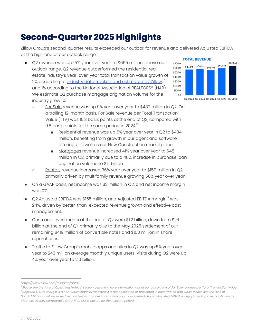 Second-Quarter 2025 Highlights Zillow Group’s second-quarter results exceeded our outlook for revenue and delivered Adjusted EBITDA at the high end of our outlook range. ● Q2 revenue was up 15% year over year to $655 million, above our outlook range. Q2 revenue outperformed the residential real estate industry’s year-over-year total transaction value growth of 2% according to industry data tracked and estimated by Zillow,17 and 1% according to the National Association of REALTORS® (NAR). We estimate Q2 purchase mortgage origination volume for the industry grew 1%. ○ For Sale revenue was up 9% year over year to $482 million in Q2. On a trailing 12-month basis, For Sale revenue per Total Transaction Value (TTV) was 10.3 basis points at the end of Q2, compared with 9.8 basis points for the same period in 2024.18 ■ Residential revenue was up 6% year over year in Q2 to $434 million, benefiting from growth in our agent and software offerings, as well as our New Construction marketplace. ■ Mortgages revenue increased 41% year over year to $48 million in Q2, primarily due to a 48% increase in purchase loan origination volume to $1.1 billion. ○ Rentals revenue increased 36% year over year to $159 million in Q2, primarily driven by multifamily revenue growing 56% year over year. ● On a GAAP basis, net income was $2 million in Q2, and net income margin was 0%. ● Q2 Adjusted EBITDA was $155 million, and Adjusted EBITDA margin19 was 24%, driven by better-than-expected revenue growth and effective cost management. ● Cash and investments at the end of Q2 were $1.2 billion, down from $1.6 billion at the end of Q1, primarily due to the May 2025 settlement of our remaining $419 million of convertible notes and $150 million in share repurchases. ● Traffic to Zillow Group’s mobile apps and sites in Q2 was up 5% year over year to 243 million average monthly unique users. Visits during Q2 were up 4% year over year to 2.6 billion. 19Adjusted EBITDA margin is a non-GAAP financial measure; it is not calculated or presented in accordance with GAAP. Please see the “Use of Non-GAAP Financial Measures” section below for more information about our presentation of Adjusted EBITDA margin, including a reconciliation to the most directly comparable GAAP financial measure for the relevant period. 18Please see the “Use of Operating Metrics” section below for more information about our calculation of For Sale revenue per Total Transaction Value. 17https://www.zillow.com/research/data/ 7 | Q2 2025