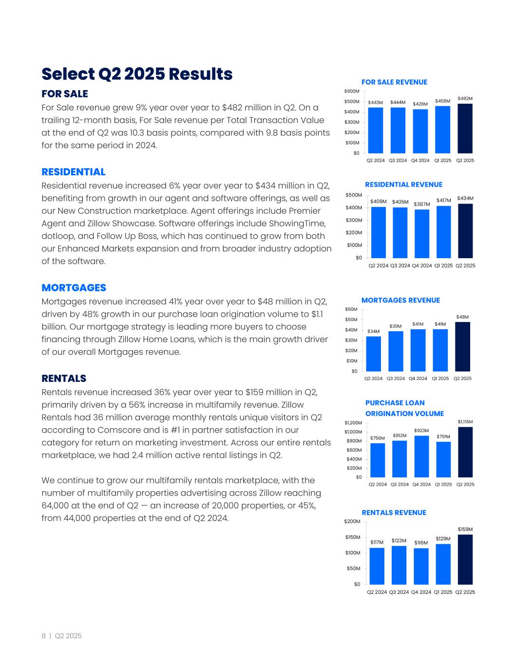 Select Q2 2025 Results FOR SALE For Sale revenue grew 9% year over year to $482 million in Q2. On a trailing 12-month basis, For Sale revenue per Total Transaction Value at the end of Q2 was 10.3 basis points, compared with 9.8 basis points for the same period in 2024. RESIDENTIAL Residential revenue increased 6% year over year to $434 million in Q2, benefiting from growth in our agent and software offerings, as well as our New Construction marketplace. Agent offerings include Premier Agent and Zillow Showcase. Software offerings include ShowingTime, dotloop, and Follow Up Boss, which has continued to grow from both our Enhanced Markets expansion and from broader industry adoption of the software. MORTGAGES Mortgages revenue increased 41% year over year to $48 million in Q2, driven by 48% growth in our purchase loan origination volume to $1.1 billion. Our mortgage strategy is leading more buyers to choose financing through Zillow Home Loans, which is the main growth driver of our overall Mortgages revenue. RENTALS Rentals revenue increased 36% year over year to $159 million in Q2, primarily driven by a 56% increase in multifamily revenue. Zillow Rentals had 36 million average monthly rentals unique visitors in Q2 according to Comscore and is #1 in partner satisfaction in our category for return on marketing investment. Across our entire rentals marketplace, we had 2.4 million active rental listings in Q2. We continue to grow our multifamily rentals marketplace, with the number of multifamily properties advertising across Zillow reaching 64,000 at the end of Q2 — an increase of 20,000 properties, or 45%, from 44,000 properties at the end of Q2 2024. 8 | Q2 2025