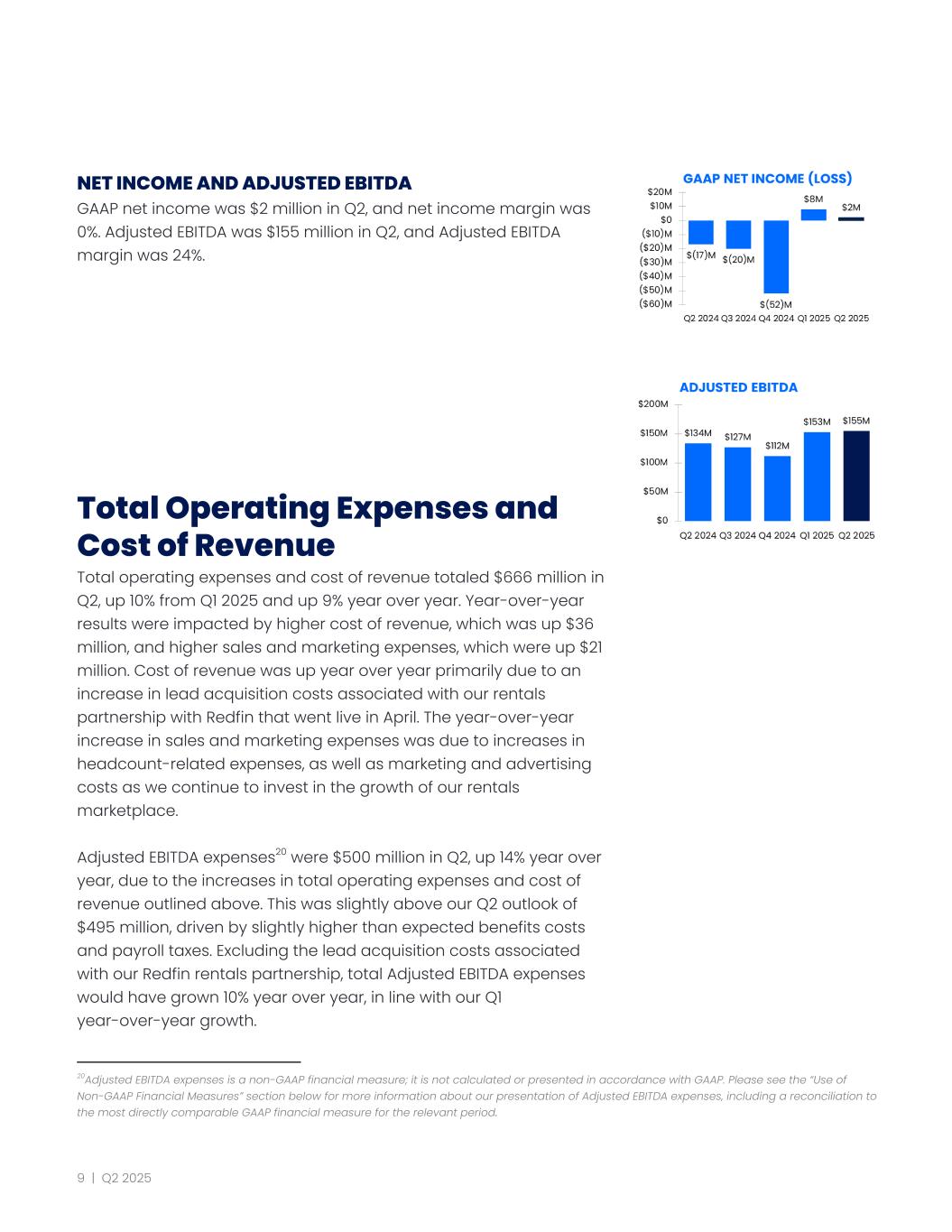 NET INCOME AND ADJUSTED EBITDA GAAP net income was $2 million in Q2, and net income margin was 0%. Adjusted EBITDA was $155 million in Q2, and Adjusted EBITDA margin was 24%. Total Operating Expenses and Cost of Revenue Total operating expenses and cost of revenue totaled $666 million in Q2, up 10% from Q1 2025 and up 9% year over year. Year-over-year results were impacted by higher cost of revenue, which was up $36 million, and higher sales and marketing expenses, which were up $21 million. Cost of revenue was up year over year primarily due to an increase in lead acquisition costs associated with our rentals partnership with Redfin that went live in April. The year-over-year increase in sales and marketing expenses was due to increases in headcount-related expenses, as well as marketing and advertising costs as we continue to invest in the growth of our rentals marketplace. Adjusted EBITDA expenses20 were $500 million in Q2, up 14% year over year, due to the increases in total operating expenses and cost of revenue outlined above. This was slightly above our Q2 outlook of $495 million, driven by slightly higher than expected benefits costs and payroll taxes. Excluding the lead acquisition costs associated with our Redfin rentals partnership, total Adjusted EBITDA expenses would have grown 10% year over year, in line with our Q1 year-over-year growth. 20Adjusted EBITDA expenses is a non-GAAP financial measure; it is not calculated or presented in accordance with GAAP. Please see the “Use of Non-GAAP Financial Measures” section below for more information about our presentation of Adjusted EBITDA expenses, including a reconciliation to the most directly comparable GAAP financial measure for the relevant period. 9 | Q2 2025
