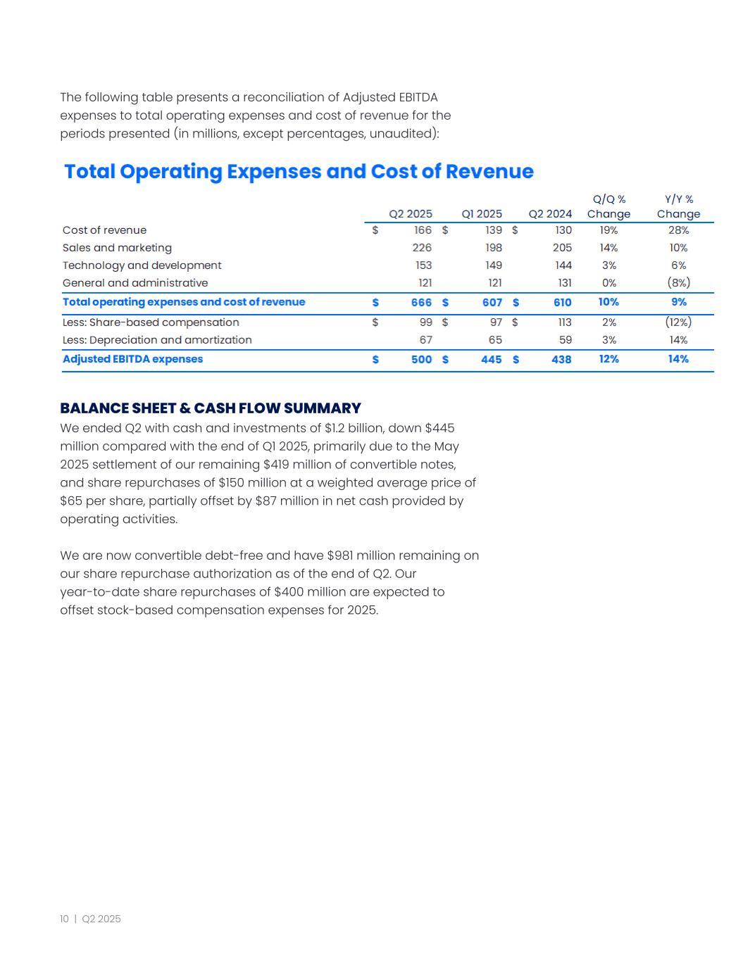 The following table presents a reconciliation of Adjusted EBITDA expenses to total operating expenses and cost of revenue for the periods presented (in millions, except percentages, unaudited): BALANCE SHEET & CASH FLOW SUMMARY We ended Q2 with cash and investments of $1.2 billion, down $445 million compared with the end of Q1 2025, primarily due to the May 2025 settlement of our remaining $419 million of convertible notes, and share repurchases of $150 million at a weighted average price of $65 per share, partially offset by $87 million in net cash provided by operating activities. We are now convertible debt-free and have $981 million remaining on our share repurchase authorization as of the end of Q2. Our year-to-date share repurchases of $400 million are expected to offset stock-based compensation expenses for 2025. 10 | Q2 2025