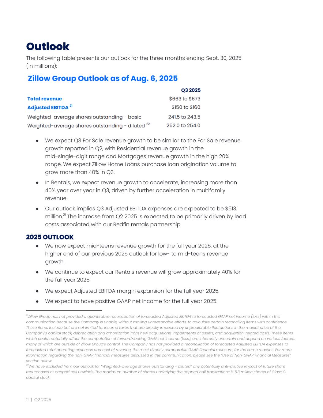 Outlook The following table presents our outlook for the three months ending Sept. 30, 2025 (in millions): 2122 ● We expect Q3 For Sale revenue growth to be similar to the For Sale revenue growth reported in Q2, with Residential revenue growth in the mid-single-digit range and Mortgages revenue growth in the high 20% range. We expect Zillow Home Loans purchase loan origination volume to grow more than 40% in Q3. ● In Rentals, we expect revenue growth to accelerate, increasing more than 40% year over year in Q3, driven by further acceleration in multifamily revenue. ● Our outlook implies Q3 Adjusted EBITDA expenses are expected to be $513 million.21 The increase from Q2 2025 is expected to be primarily driven by lead costs associated with our Redfin rentals partnership. 2025 OUTLOOK ● We now expect mid-teens revenue growth for the full year 2025, at the higher end of our previous 2025 outlook for low- to mid-teens revenue growth. ● We continue to expect our Rentals revenue will grow approximately 40% for the full year 2025. ● We expect Adjusted EBITDA margin expansion for the full year 2025. ● We expect to have positive GAAP net income for the full year 2025. 22We have excluded from our outlook for “Weighted-average shares outstanding - diluted” any potentially anti-dilutive impact of future share repurchases or capped call unwinds. The maximum number of shares underlying the capped call transactions is 5.3 million shares of Class C capital stock. 21Zillow Group has not provided a quantitative reconciliation of forecasted Adjusted EBITDA to forecasted GAAP net income (loss) within this communication because the Company is unable, without making unreasonable efforts, to calculate certain reconciling items with confidence. These items include but are not limited to: income taxes that are directly impacted by unpredictable fluctuations in the market price of the Company’s capital stock, depreciation and amortization from new acquisitions, impairments of assets, and acquisition-related costs. These items, which could materially affect the computation of forward-looking GAAP net income (loss), are inherently uncertain and depend on various factors, many of which are outside of Zillow Group’s control. The Company has not provided a reconciliation of forecasted Adjusted EBITDA expenses to forecasted total operating expenses and cost of revenue, the most directly comparable GAAP financial measure, for the same reasons. For more information regarding the non-GAAP financial measures discussed in this communication, please see the “Use of Non-GAAP Financial Measures” section below. 11 | Q2 2025