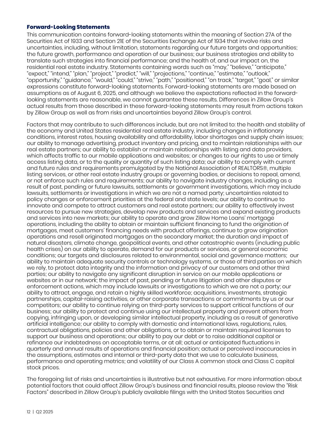 Forward-Looking Statements This communication contains forward-looking statements within the meaning of Section 27A of the Securities Act of 1933 and Section 21E of the Securities Exchange Act of 1934 that involve risks and uncertainties, including, without limitation, statements regarding our future targets and opportunities; the future growth, performance and operation of our business; our business strategies and ability to translate such strategies into financial performance; and the health of, and our impact on, the residential real estate industry. Statements containing words such as “may,” “believe,” “anticipate,” “expect,” “intend,” “plan,” “project,” “predict,” “will,” “projections,” “continue,” “estimate,” “outlook,” “opportunity,” “guidance,” “would,” “could,” “strive,” “path,” “positioned,” “on track,” “target,” “goal,” or similar expressions constitute forward-looking statements. Forward-looking statements are made based on assumptions as of August 6, 2025, and although we believe the expectations reflected in the forward- looking statements are reasonable, we cannot guarantee these results. Differences in Zillow Group’s actual results from those described in these forward-looking statements may result from actions taken by Zillow Group as well as from risks and uncertainties beyond Zillow Group’s control. Factors that may contribute to such differences include, but are not limited to: the health and stability of the economy and United States residential real estate industry, including changes in inflationary conditions, interest rates, housing availability and affordability, labor shortages and supply chain issues; our ability to manage advertising, product inventory and pricing, and to maintain relationships with our real estate partners; our ability to establish or maintain relationships with listing and data providers, which affects traffic to our mobile applications and websites; or changes to our rights to use or timely access listing data, or to the quality or quantity of such listing data; our ability to comply with current and future rules and requirements promulgated by the National Association of REALTORS®, multiple listing services, or other real estate industry groups or governing bodies, or decisions to repeal, amend, or not enforce such rules and requirements; our ability to navigate industry changes, including as a result of past, pending or future lawsuits, settlements or government investigations, which may include lawsuits, settlements or investigations in which we are not a named party; uncertainties related to policy changes or enforcement priorities at the federal and state levels; our ability to continue to innovate and compete to attract customers and real estate partners; our ability to effectively invest resources to pursue new strategies, develop new products and services and expand existing products and services into new markets; our ability to operate and grow Zillow Home Loans’ mortgage operations, including the ability to obtain or maintain sufficient financing to fund the origination of mortgages, meet customers’ financing needs with product offerings, continue to grow origination operations and resell originated mortgages on the secondary market; the duration and impact of natural disasters, climate change, geopolitical events, and other catastrophic events (including public health crises) on our ability to operate, demand for our products or services, or general economic conditions; our targets and disclosures related to environmental, social and governance matters; our ability to maintain adequate security controls or technology systems, or those of third parties on which we rely, to protect data integrity and the information and privacy of our customers and other third parties; our ability to navigate any significant disruption in service on our mobile applications or websites or in our network; the impact of past, pending or future litigation and other disputes or enforcement actions, which may include lawsuits or investigations to which we are not a party; our ability to attract, engage, and retain a highly skilled workforce; acquisitions, investments, strategic partnerships, capital-raising activities, or other corporate transactions or commitments by us or our competitors; our ability to continue relying on third-party services to support critical functions of our business; our ability to protect and continue using our intellectual property and prevent others from copying, infringing upon, or developing similar intellectual property, including as a result of generative artificial intelligence; our ability to comply with domestic and international laws, regulations, rules, contractual obligations, policies and other obligations, or to obtain or maintain required licenses to support our business and operations; our ability to pay our debt or to raise additional capital or refinance our indebtedness on acceptable terms, or at all; actual or anticipated fluctuations in quarterly and annual results of operations and financial position; actual or perceived inaccuracies in the assumptions, estimates and internal or third-party data that we use to calculate business, performance and operating metrics; and volatility of our Class A common stock and Class C capital stock prices. The foregoing list of risks and uncertainties is illustrative but not exhaustive. For more information about potential factors that could affect Zillow Group’s business and financial results, please review the “Risk Factors” described in Zillow Group’s publicly available filings with the United States Securities and 12 | Q2 2025