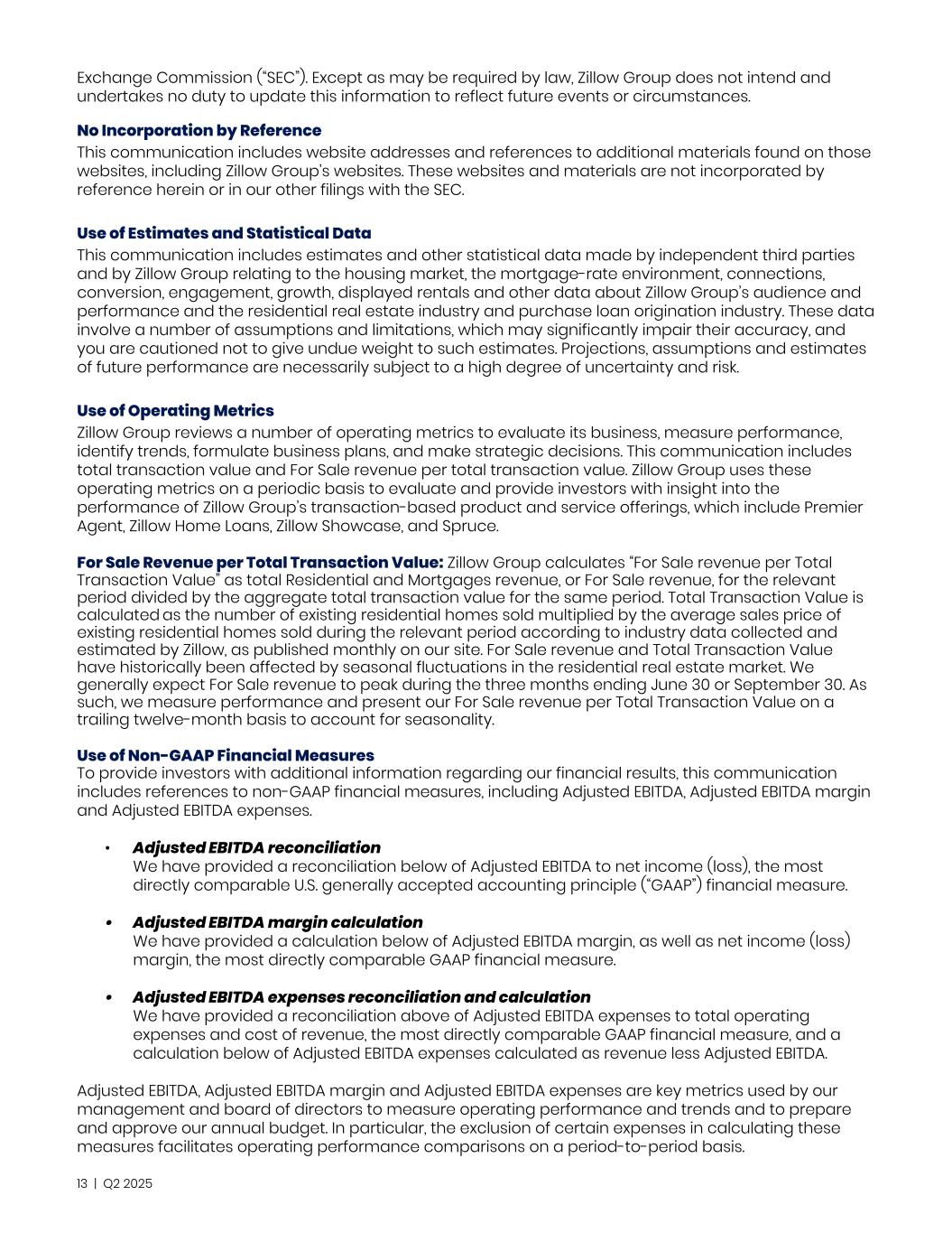 Exchange Commission (“SEC”). Except as may be required by law, Zillow Group does not intend and undertakes no duty to update this information to reflect future events or circumstances. No Incorporation by Reference This communication includes website addresses and references to additional materials found on those websites, including Zillow Group’s websites. These websites and materials are not incorporated by reference herein or in our other filings with the SEC. Use of Estimates and Statistical Data This communication includes estimates and other statistical data made by independent third parties and by Zillow Group relating to the housing market, the mortgage-rate environment, connections, conversion, engagement, growth, displayed rentals and other data about Zillow Group’s audience and performance and the residential real estate industry and purchase loan origination industry. These data involve a number of assumptions and limitations, which may significantly impair their accuracy, and you are cautioned not to give undue weight to such estimates. Projections, assumptions and estimates of future performance are necessarily subject to a high degree of uncertainty and risk. Use of Operating Metrics Zillow Group reviews a number of operating metrics to evaluate its business, measure performance, identify trends, formulate business plans, and make strategic decisions. This communication includes total transaction value and For Sale revenue per total transaction value. Zillow Group uses these operating metrics on a periodic basis to evaluate and provide investors with insight into the performance of Zillow Group’s transaction-based product and service offerings, which include Premier Agent, Zillow Home Loans, Zillow Showcase, and Spruce. For Sale Revenue per Total Transaction Value: Zillow Group calculates “For Sale revenue per Total Transaction Value” as total Residential and Mortgages revenue, or For Sale revenue, for the relevant period divided by the aggregate total transaction value for the same period. Total Transaction Value is calculated as the number of existing residential homes sold multiplied by the average sales price of existing residential homes sold during the relevant period according to industry data collected and estimated by Zillow, as published monthly on our site. For Sale revenue and Total Transaction Value have historically been affected by seasonal fluctuations in the residential real estate market. We generally expect For Sale revenue to peak during the three months ending June 30 or September 30. As such, we measure performance and present our For Sale revenue per Total Transaction Value on a trailing twelve-month basis to account for seasonality. Use of Non-GAAP Financial Measures To provide investors with additional information regarding our financial results, this communication includes references to non-GAAP financial measures, including Adjusted EBITDA, Adjusted EBITDA margin and Adjusted EBITDA expenses. • Adjusted EBITDA reconciliation We have provided a reconciliation below of Adjusted EBITDA to net income (loss), the most directly comparable U.S. generally accepted accounting principle (“GAAP”) financial measure. • Adjusted EBITDA margin calculation We have provided a calculation below of Adjusted EBITDA margin, as well as net income (loss) margin, the most directly comparable GAAP financial measure. • Adjusted EBITDA expenses reconciliation and calculation We have provided a reconciliation above of Adjusted EBITDA expenses to total operating expenses and cost of revenue, the most directly comparable GAAP financial measure, and a calculation below of Adjusted EBITDA expenses calculated as revenue less Adjusted EBITDA. Adjusted EBITDA, Adjusted EBITDA margin and Adjusted EBITDA expenses are key metrics used by our management and board of directors to measure operating performance and trends and to prepare and approve our annual budget. In particular, the exclusion of certain expenses in calculating these measures facilitates operating performance comparisons on a period-to-period basis. 13 | Q2 2025
