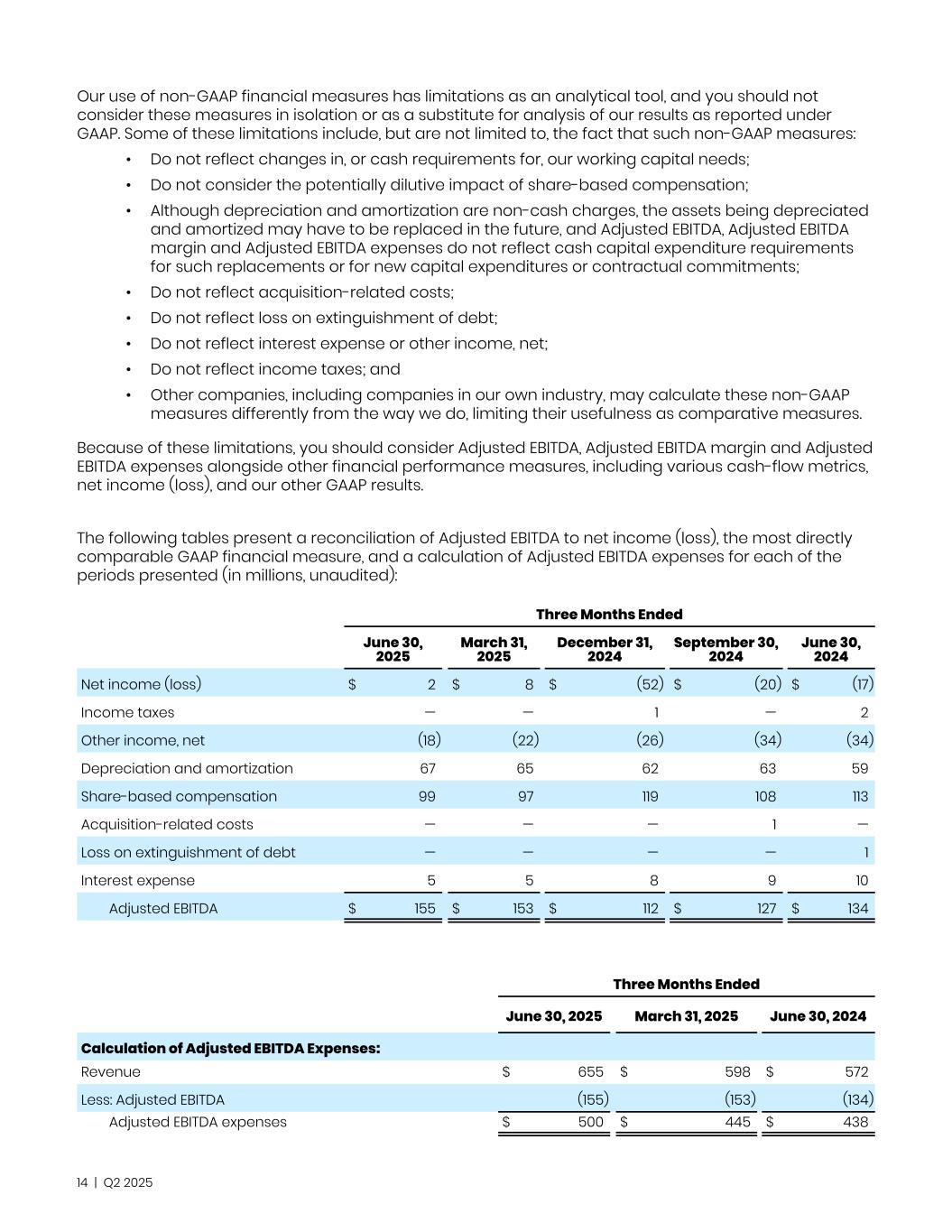 Our use of non-GAAP financial measures has limitations as an analytical tool, and you should not consider these measures in isolation or as a substitute for analysis of our results as reported under GAAP. Some of these limitations include, but are not limited to, the fact that such non-GAAP measures: • Do not reflect changes in, or cash requirements for, our working capital needs; • Do not consider the potentially dilutive impact of share-based compensation; • Although depreciation and amortization are non-cash charges, the assets being depreciated and amortized may have to be replaced in the future, and Adjusted EBITDA, Adjusted EBITDA margin and Adjusted EBITDA expenses do not reflect cash capital expenditure requirements for such replacements or for new capital expenditures or contractual commitments; • Do not reflect acquisition-related costs; • Do not reflect loss on extinguishment of debt; • Do not reflect interest expense or other income, net; • Do not reflect income taxes; and • Other companies, including companies in our own industry, may calculate these non-GAAP measures differently from the way we do, limiting their usefulness as comparative measures. Because of these limitations, you should consider Adjusted EBITDA, Adjusted EBITDA margin and Adjusted EBITDA expenses alongside other financial performance measures, including various cash-flow metrics, net income (loss), and our other GAAP results. The following tables present a reconciliation of Adjusted EBITDA to net income (loss), the most directly comparable GAAP financial measure, and a calculation of Adjusted EBITDA expenses for each of the periods presented (in millions, unaudited): Three Months Ended June 30, 2025 March 31, 2025 December 31, 2024 September 30, 2024 June 30, 2024 Net income (loss) $ 2 $ 8 $ (52) $ (20) $ (17) Income taxes — — 1 — 2 Other income, net (18) (22) (26) (34) (34) Depreciation and amortization 67 65 62 63 59 Share-based compensation 99 97 119 108 113 Acquisition-related costs — — — 1 — Loss on extinguishment of debt — — — — 1 Interest expense 5 5 8 9 10 Adjusted EBITDA $ 155 $ 153 $ 112 $ 127 $ — $ 134 Three Months Ended June 30, 2025 March 31, 2025 June 30, 2024 Calculation of Adjusted EBITDA Expenses: Revenue $ 655 $ 598 $ 572 Less: Adjusted EBITDA (155) (153) (134) Adjusted EBITDA expenses $ 500 $ 445 $ 438 14 | Q2 2025