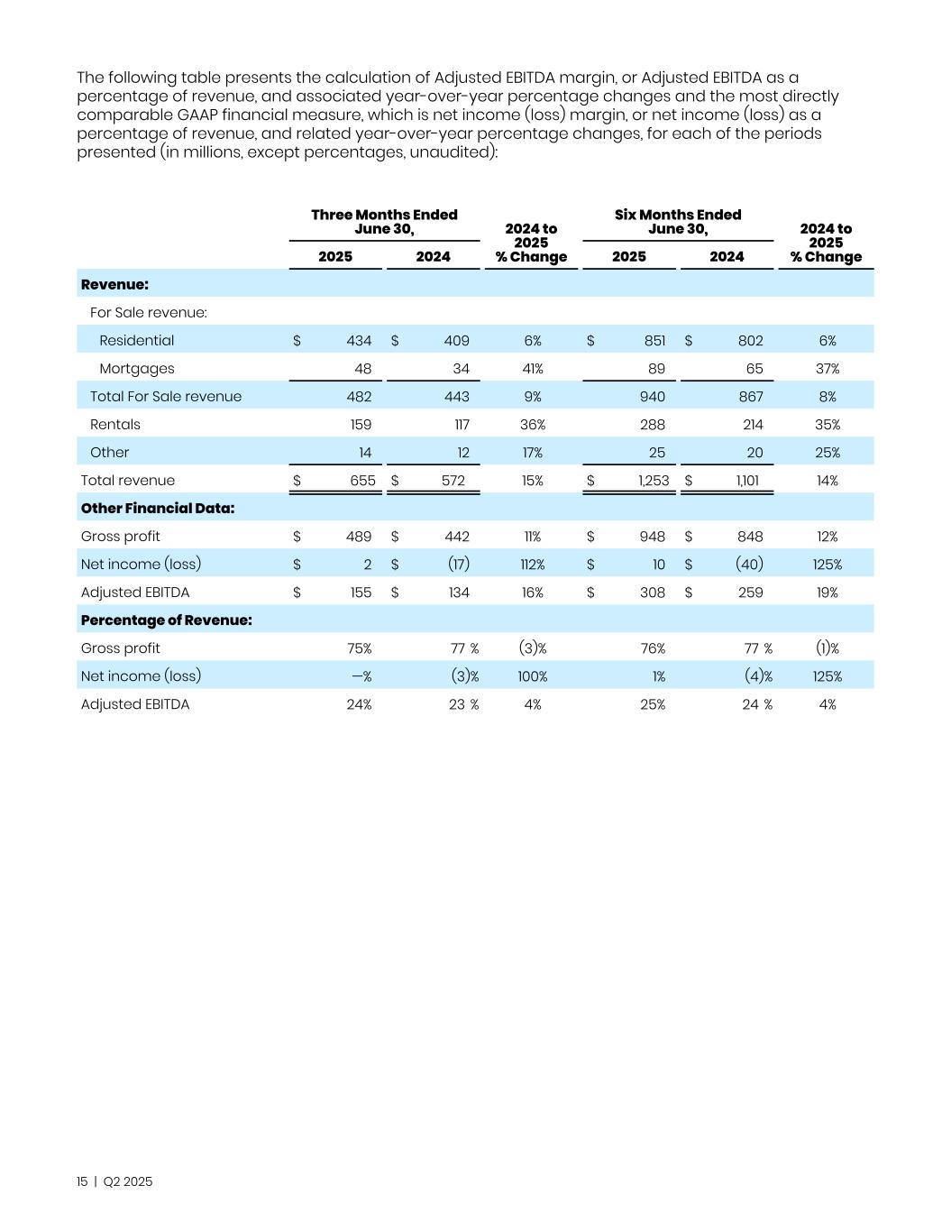 The following table presents the calculation of Adjusted EBITDA margin, or Adjusted EBITDA as a percentage of revenue, and associated year-over-year percentage changes and the most directly comparable GAAP financial measure, which is net income (loss) margin, or net income (loss) as a percentage of revenue, and related year-over-year percentage changes, for each of the periods presented (in millions, except percentages, unaudited): Three Months Ended June 30, 2024 to 2025 % Change Six Months Ended June 30, 2024 to 2025 % Change2025 2024 2025 2024 Revenue: For Sale revenue: Residential $ 434 $ 409 6% $ 851 $ 802 6% Mortgages 48 34 41% 89 65 37% Total For Sale revenue 482 443 9% 940 867 8% Rentals 159 117 36% 288 214 35% Other 14 12 17% 25 20 25% Total revenue $ 655 $ 572 15% $ 1,253 $ 1,101 14% Other Financial Data: Gross profit $ 489 $ 442 11% $ 948 $ 848 12% Net income (loss) $ 2 $ (17) 112% $ 10 $ (40) 125% Adjusted EBITDA $ 155 $ 134 16% $ 308 $ 259 19% Percentage of Revenue: Gross profit 75 % 77 % (3)% 76 % 77 % (1)% Net income (loss) — % (3) % 100% 1 % (4) % 125% Adjusted EBITDA 24 % 23 % 4% 25 % 24 % 4% 15 | Q2 2025