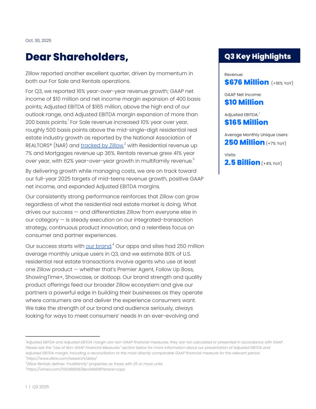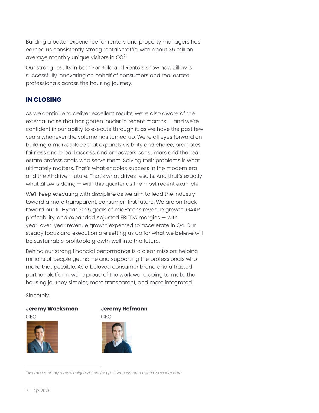 Building a better experience for renters and property managers has earned us consistently strong rentals traffic, with about 35 million average monthly unique visitors in Q3.31 Our strong results in both For Sale and Rentals show how Zillow is successfully innovating on behalf of consumers and real estate professionals across the housing journey. IN CLOSING As we continue to deliver excellent results, we’re also aware of the external noise that has gotten louder in recent months — and we’re confident in our ability to execute through it, as we have the past few years whenever the volume has turned up. We’re all eyes forward on building a marketplace that expands visibility and choice, promotes fairness and broad access, and empowers consumers and the real estate professionals who serve them. Solving their problems is what ultimately matters. That’s what enables success in the modern era and the AI-driven future. That’s what drives results. And that’s exactly what Zillow is doing — with this quarter as the most recent example. We’ll keep executing with discipline as we aim to lead the industry toward a more transparent, consumer-first future. We are on track toward our full-year 2025 goals of mid-teens revenue growth, GAAP profitability, and expanded Adjusted EBITDA margins — with year-over-year revenue growth expected to accelerate in Q4. Our steady focus and execution are setting us up for what we believe will be sustainable profitable growth well into the future. Behind our strong financial performance is a clear mission: helping millions of people get home and supporting the professionals who make that possible. As a beloved consumer brand and a trusted partner platform, we’re proud of the work we’re doing to make the housing journey simpler, more transparent, and more integrated. Sincerely, Jeremy Wacksman​ ​ Jeremy Hofmann CEO​ ​ ​ ​ CFO ​ ​ ​ 31Average monthly rentals unique visitors for Q3 2025, estimated using Comscore data 7 | Q3 2025