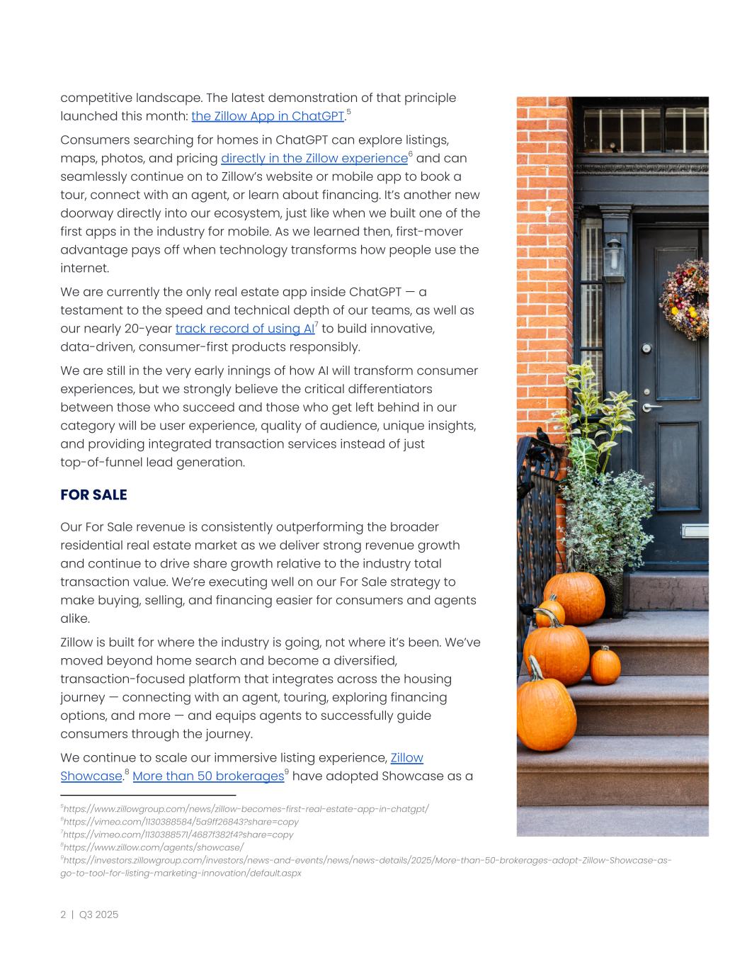 competitive landscape. The latest demonstration of that principle launched this month: the Zillow App in ChatGPT.5 Consumers searching for homes in ChatGPT can explore listings, maps, photos, and pricing directly in the Zillow experience6 and can seamlessly continue on to Zillow’s website or mobile app to book a tour, connect with an agent, or learn about financing. It’s another new doorway directly into our ecosystem, just like when we built one of the first apps in the industry for mobile. As we learned then, first-mover advantage pays off when technology transforms how people use the internet. We are currently the only real estate app inside ChatGPT — a testament to the speed and technical depth of our teams, as well as our nearly 20-year track record of using AI7 to build innovative, data-driven, consumer-first products responsibly. We are still in the very early innings of how AI will transform consumer experiences, but we strongly believe the critical differentiators between those who succeed and those who get left behind in our category will be user experience, quality of audience, unique insights, and providing integrated transaction services instead of just top-of-funnel lead generation. FOR SALE Our For Sale revenue is consistently outperforming the broader residential real estate market as we deliver strong revenue growth and continue to drive share growth relative to the industry total transaction value. We’re executing well on our For Sale strategy to make buying, selling, and financing easier for consumers and agents alike. Zillow is built for where the industry is going, not where it’s been. We’ve moved beyond home search and become a diversified, transaction-focused platform that integrates across the housing journey — connecting with an agent, touring, exploring financing options, and more — and equips agents to successfully guide consumers through the journey. We continue to scale our immersive listing experience, Zillow Showcase.8 More than 50 brokerages9 have adopted Showcase as a 9https://investors.zillowgroup.com/investors/news-and-events/news/news-details/2025/More-than-50-brokerages-adopt-Zillow-Showcase-as- go-to-tool-for-listing-marketing-innovation/default.aspx 8https://www.zillow.com/agents/showcase/ 7https://vimeo.com/1130388571/4687f382f4?share=copy 6https://vimeo.com/1130388584/5a9ff26843?share=copy 5https://www.zillowgroup.com/news/zillow-becomes-first-real-estate-app-in-chatgpt/ 2 | Q3 2025