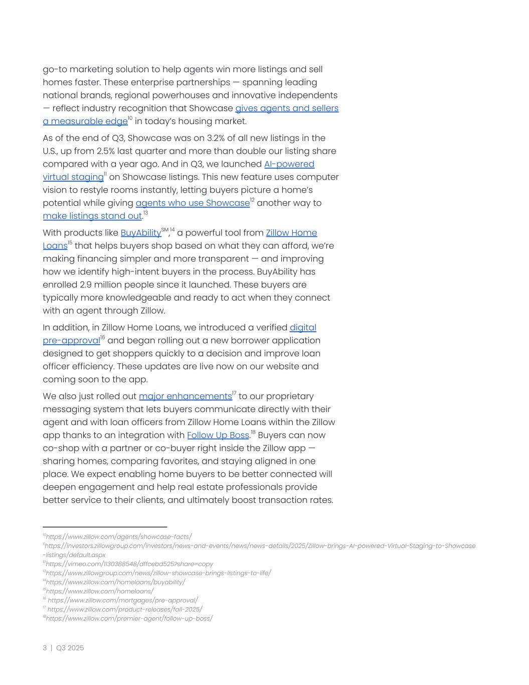 go-to marketing solution to help agents win more listings and sell homes faster. These enterprise partnerships — spanning leading national brands, regional powerhouses and innovative independents — reflect industry recognition that Showcase gives agents and sellers a measurable edge10 in today’s housing market. As of the end of Q3, Showcase was on 3.2% of all new listings in the U.S., up from 2.5% last quarter and more than double our listing share compared with a year ago. And in Q3, we launched AI-powered virtual staging11 on Showcase listings. This new feature uses computer vision to restyle rooms instantly, letting buyers picture a home’s potential while giving agents who use Showcase12 another way to make listings stand out.13 With products like BuyAbilitySM,14 a powerful tool from Zillow Home Loans15 that helps buyers shop based on what they can afford, we’re making financing simpler and more transparent — and improving how we identify high-intent buyers in the process. BuyAbility has enrolled 2.9 million people since it launched. These buyers are typically more knowledgeable and ready to act when they connect with an agent through Zillow. In addition, in Zillow Home Loans, we introduced a verified digital pre-approval16 and began rolling out a new borrower application designed to get shoppers quickly to a decision and improve loan officer efficiency. These updates are live now on our website and coming soon to the app. We also just rolled out major enhancements17 to our proprietary messaging system that lets buyers communicate directly with their agent and with loan officers from Zillow Home Loans within the Zillow app thanks to an integration with Follow Up Boss.18 Buyers can now co-shop with a partner or co-buyer right inside the Zillow app — sharing homes, comparing favorites, and staying aligned in one place. We expect enabling home buyers to be better connected will deepen engagement and help real estate professionals provide better service to their clients, and ultimately boost transaction rates. 18https://www.zillow.com/premier-agent/follow-up-boss/ 17 https://www.zillow.com/product-releases/fall-2025/ 16 https://www.zillow.com/mortgages/pre-approval/ 15https://www.zillow.com/homeloans/ 14https://www.zillow.com/homeloans/buyability/ 13https://www.zillowgroup.com/news/zillow-showcase-brings-listings-to-life/ 12https://vimeo.com/1130388548/dffcebd525?share=copy 11https://investors.zillowgroup.com/investors/news-and-events/news/news-details/2025/Zillow-brings-AI-powered-Virtual-Staging-to-Showcase -listings/default.aspx 10https://www.zillow.com/agents/showcase-facts/ 3 | Q3 2025