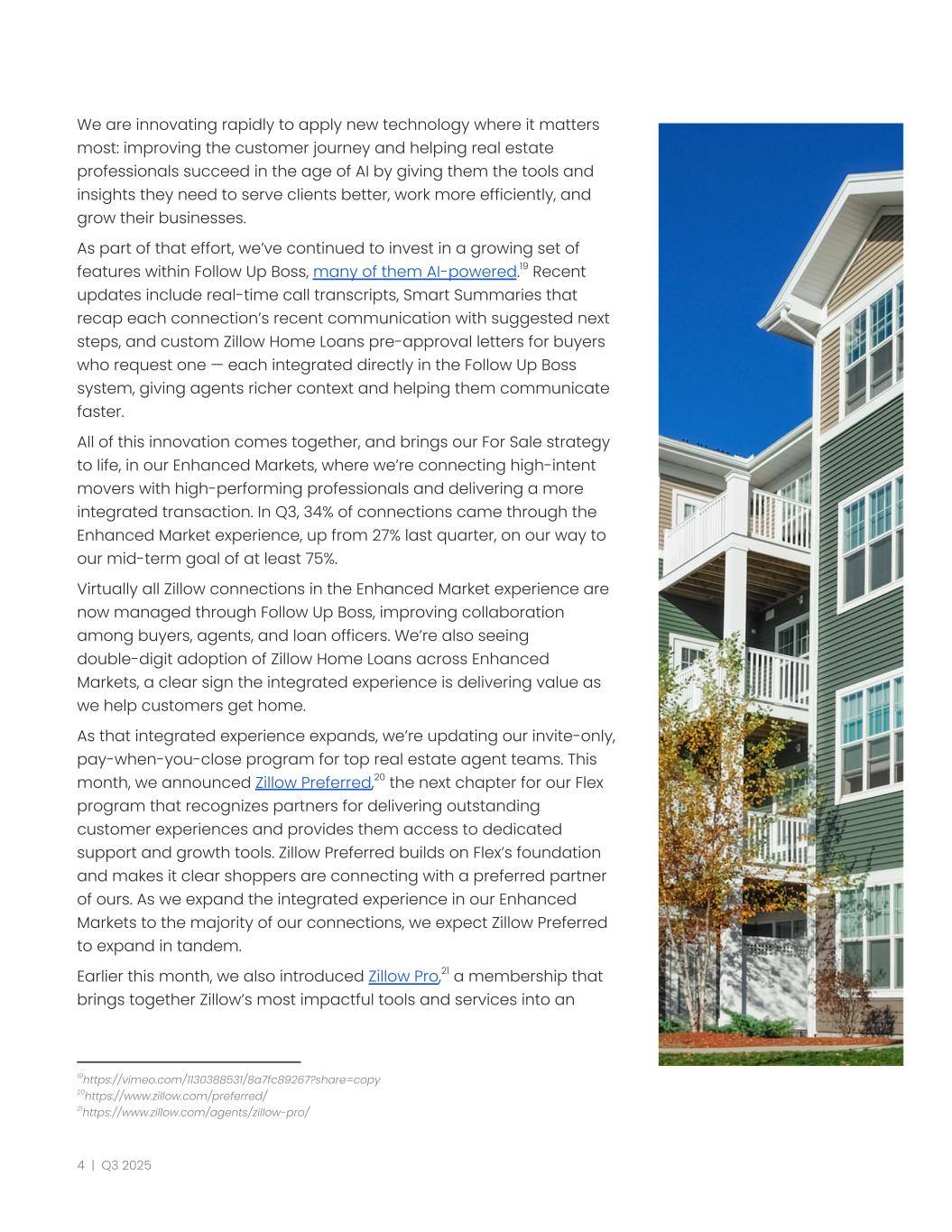 We are innovating rapidly to apply new technology where it matters most: improving the customer journey and helping real estate professionals succeed in the age of AI by giving them the tools and insights they need to serve clients better, work more efficiently, and grow their businesses. As part of that effort, we’ve continued to invest in a growing set of features within Follow Up Boss, many of them AI-powered.19 Recent updates include real-time call transcripts, Smart Summaries that recap each connection’s recent communication with suggested next steps, and custom Zillow Home Loans pre-approval letters for buyers who request one — each integrated directly in the Follow Up Boss system, giving agents richer context and helping them communicate faster. All of this innovation comes together, and brings our For Sale strategy to life, in our Enhanced Markets, where we’re connecting high-intent movers with high-performing professionals and delivering a more integrated transaction. In Q3, 34% of connections came through the Enhanced Market experience, up from 27% last quarter, on our way to our mid-term goal of at least 75%. Virtually all Zillow connections in the Enhanced Market experience are now managed through Follow Up Boss, improving collaboration among buyers, agents, and loan officers. We’re also seeing double-digit adoption of Zillow Home Loans across Enhanced Markets, a clear sign the integrated experience is delivering value as we help customers get home. As that integrated experience expands, we’re updating our invite-only, pay-when-you-close program for top real estate agent teams. This month, we announced Zillow Preferred,20 the next chapter for our Flex program that recognizes partners for delivering outstanding customer experiences and provides them access to dedicated support and growth tools. Zillow Preferred builds on Flex’s foundation and makes it clear shoppers are connecting with a preferred partner of ours. As we expand the integrated experience in our Enhanced Markets to the majority of our connections, we expect Zillow Preferred to expand in tandem. Earlier this month, we also introduced Zillow Pro,21 a membership that brings together Zillow’s most impactful tools and services into an 21https://www.zillow.com/agents/zillow-pro/ 20https://www.zillow.com/preferred/ 19https://vimeo.com/1130388531/8a7fc89267?share=copy 4 | Q3 2025