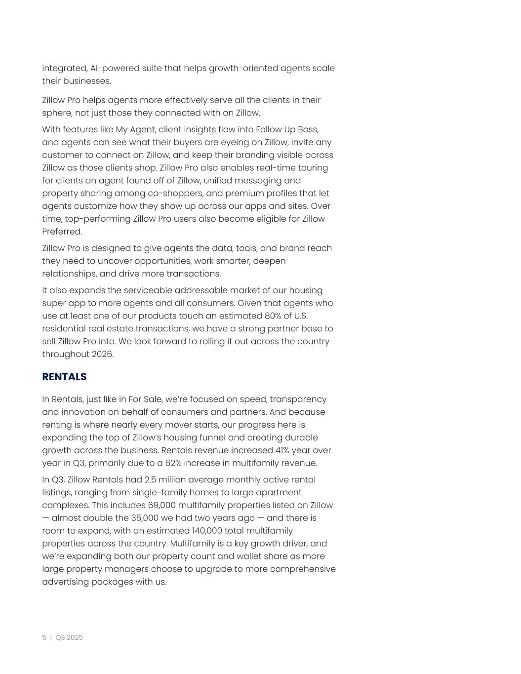 integrated, AI-powered suite that helps growth-oriented agents scale their businesses. Zillow Pro helps agents more effectively serve all the clients in their sphere, not just those they connected with on Zillow. With features like My Agent, client insights flow into Follow Up Boss, and agents can see what their buyers are eyeing on Zillow, invite any customer to connect on Zillow, and keep their branding visible across Zillow as those clients shop. Zillow Pro also enables real-time touring for clients an agent found off of Zillow, unified messaging and property sharing among co-shoppers, and premium profiles that let agents customize how they show up across our apps and sites. Over time, top-performing Zillow Pro users also become eligible for Zillow Preferred. Zillow Pro is designed to give agents the data, tools, and brand reach they need to uncover opportunities, work smarter, deepen relationships, and drive more transactions. It also expands the serviceable addressable market of our housing super app to more agents and all consumers. Given that agents who use at least one of our products touch an estimated 80% of U.S. residential real estate transactions, we have a strong partner base to sell Zillow Pro into. We look forward to rolling it out across the country throughout 2026. RENTALS In Rentals, just like in For Sale, we’re focused on speed, transparency and innovation on behalf of consumers and partners. And because renting is where nearly every mover starts, our progress here is expanding the top of Zillow’s housing funnel and creating durable growth across the business. Rentals revenue increased 41% year over year in Q3, primarily due to a 62% increase in multifamily revenue. In Q3, Zillow Rentals had 2.5 million average monthly active rental listings, ranging from single-family homes to large apartment complexes. This includes 69,000 multifamily properties listed on Zillow — almost double the 35,000 we had two years ago — and there is room to expand, with an estimated 140,000 total multifamily properties across the country. Multifamily is a key growth driver, and we’re expanding both our property count and wallet share as more large property managers choose to upgrade to more comprehensive advertising packages with us. 5 | Q3 2025