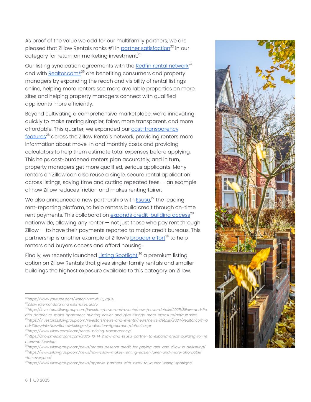 As proof of the value we add for our multifamily partners, we are pleased that Zillow Rentals ranks #1 in partner satisfaction22 in our category for return on marketing investment.23 Our listing syndication agreements with the Redfin rental network24 and with Realtor.com®25 are benefiting consumers and property managers by expanding the reach and visibility of rental listings online, helping more renters see more available properties on more sites and helping property managers connect with qualified applicants more efficiently. Beyond cultivating a comprehensive marketplace, we’re innovating quickly to make renting simpler, fairer, more transparent, and more affordable. This quarter, we expanded our cost-transparency features26 across the Zillow Rentals network, providing renters more information about move-in and monthly costs and providing calculators to help them estimate total expenses before applying. This helps cost-burdened renters plan accurately, and in turn, property managers get more qualified, serious applicants. Many renters on Zillow can also reuse a single, secure rental application across listings, saving time and cutting repeated fees — an example of how Zillow reduces friction and makes renting fairer. We also announced a new partnership with Esusu,27 the leading rent-reporting platform, to help renters build credit through on-time rent payments. This collaboration expands credit-building access28 nationwide, allowing any renter — not just those who pay rent through Zillow — to have their payments reported to major credit bureaus. This partnership is another example of Zillow’s broader effort29 to help renters and buyers access and afford housing. Finally, we recently launched Listing Spotlight,30 a premium listing option on Zillow Rentals that gives single-family rentals and smaller buildings the highest exposure available to this category on Zillow. 30https://www.zillowgroup.com/news/appfolio-partners-with-zillow-to-launch-listing-spotlight/ 29https://www.zillowgroup.com/news/how-zillow-makes-renting-easier-fairer-and-more-affordable -for-everyone/ 28https://www.zillowgroup.com/news/renters-deserve-credit-for-paying-rent-and-zillow-is-delivering/ 27https://zillow.mediaroom.com/2025-10-14-Zillow-and-Esusu-partner-to-expand-credit-building-for-re nters-nationwide 26https://www.zillow.com/learn/rental-pricing-transparency/ 25https://investors.zillowgroup.com/investors/news-and-events/news/news-details/2024/Realtor.com-a nd-Zillow-Ink-New-Rental-Listings-Syndication-Agreement/default.aspx 24https://investors.zillowgroup.com/investors/news-and-events/news/news-details/2025/Zillow-and-Re dfin-partner-to-make-apartment-hunting-easier-and-give-listings-more-exposure/default.aspx 23Zillow internal data and estimates, 2025 22https://www.youtube.com/watch?v=PS1iG3_ZguA 6 | Q3 2025