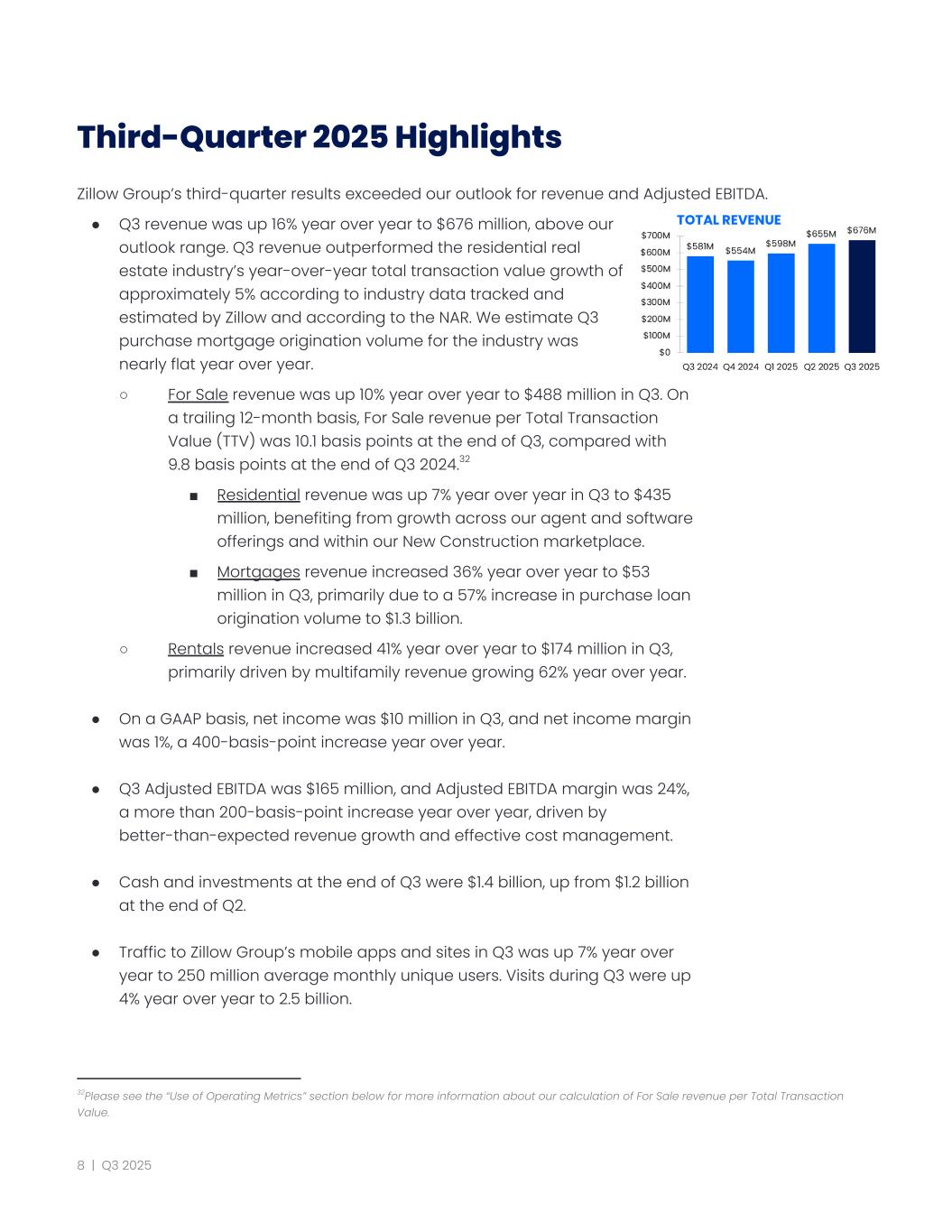 Third-Quarter 2025 Highlights Zillow Group’s third-quarter results exceeded our outlook for revenue and Adjusted EBITDA. ●​ Q3 revenue was up 16% year over year to $676 million, above our outlook range. Q3 revenue outperformed the residential real estate industry’s year-over-year total transaction value growth of approximately 5% according to industry data tracked and estimated by Zillow and according to the NAR. We estimate Q3 purchase mortgage origination volume for the industry was nearly flat year over year. ○​ For Sale revenue was up 10% year over year to $488 million in Q3. On a trailing 12-month basis, For Sale revenue per Total Transaction Value (TTV) was 10.1 basis points at the end of Q3, compared with 9.8 basis points at the end of Q3 2024.32 ■​ Residential revenue was up 7% year over year in Q3 to $435 million, benefiting from growth across our agent and software offerings and within our New Construction marketplace. ■​ Mortgages revenue increased 36% year over year to $53 million in Q3, primarily due to a 57% increase in purchase loan origination volume to $1.3 billion. ○​ Rentals revenue increased 41% year over year to $174 million in Q3, primarily driven by multifamily revenue growing 62% year over year. ●​ On a GAAP basis, net income was $10 million in Q3, and net income margin was 1%, a 400-basis-point increase year over year. ●​ Q3 Adjusted EBITDA was $165 million, and Adjusted EBITDA margin was 24%, a more than 200-basis-point increase year over year, driven by better-than-expected revenue growth and effective cost management. ●​ Cash and investments at the end of Q3 were $1.4 billion, up from $1.2 billion at the end of Q2. ●​ Traffic to Zillow Group’s mobile apps and sites in Q3 was up 7% year over year to 250 million average monthly unique users. Visits during Q3 were up 4% year over year to 2.5 billion. 32Please see the “Use of Operating Metrics” section below for more information about our calculation of For Sale revenue per Total Transaction Value. 8 | Q3 2025