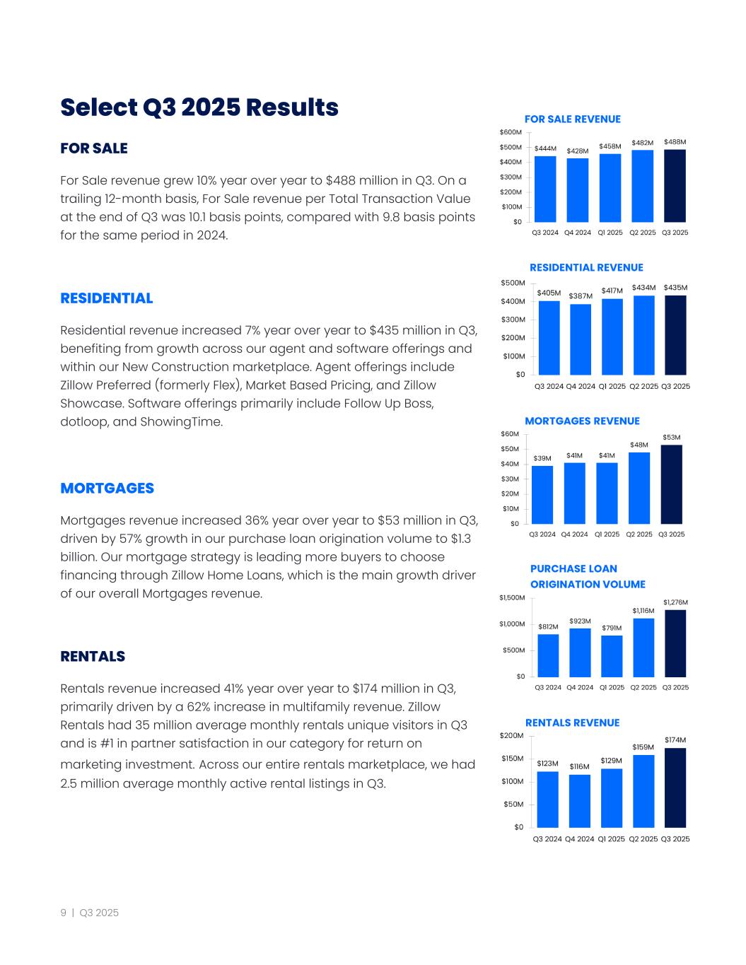 Select Q3 2025 Results FOR SALE For Sale revenue grew 10% year over year to $488 million in Q3. On a trailing 12-month basis, For Sale revenue per Total Transaction Value at the end of Q3 was 10.1 basis points, compared with 9.8 basis points for the same period in 2024. RESIDENTIAL Residential revenue increased 7% year over year to $435 million in Q3, benefiting from growth across our agent and software offerings and within our New Construction marketplace. Agent offerings include Zillow Preferred (formerly Flex), Market Based Pricing, and Zillow Showcase. Software offerings primarily include Follow Up Boss, dotloop, and ShowingTime. MORTGAGES Mortgages revenue increased 36% year over year to $53 million in Q3, driven by 57% growth in our purchase loan origination volume to $1.3 billion. Our mortgage strategy is leading more buyers to choose financing through Zillow Home Loans, which is the main growth driver of our overall Mortgages revenue. RENTALS Rentals revenue increased 41% year over year to $174 million in Q3, primarily driven by a 62% increase in multifamily revenue. Zillow Rentals had 35 million average monthly rentals unique visitors in Q3 and is #1 in partner satisfaction in our category for return on marketing investment. Across our entire rentals marketplace, we had 2.5 million average monthly active rental listings in Q3. 9 | Q3 2025
