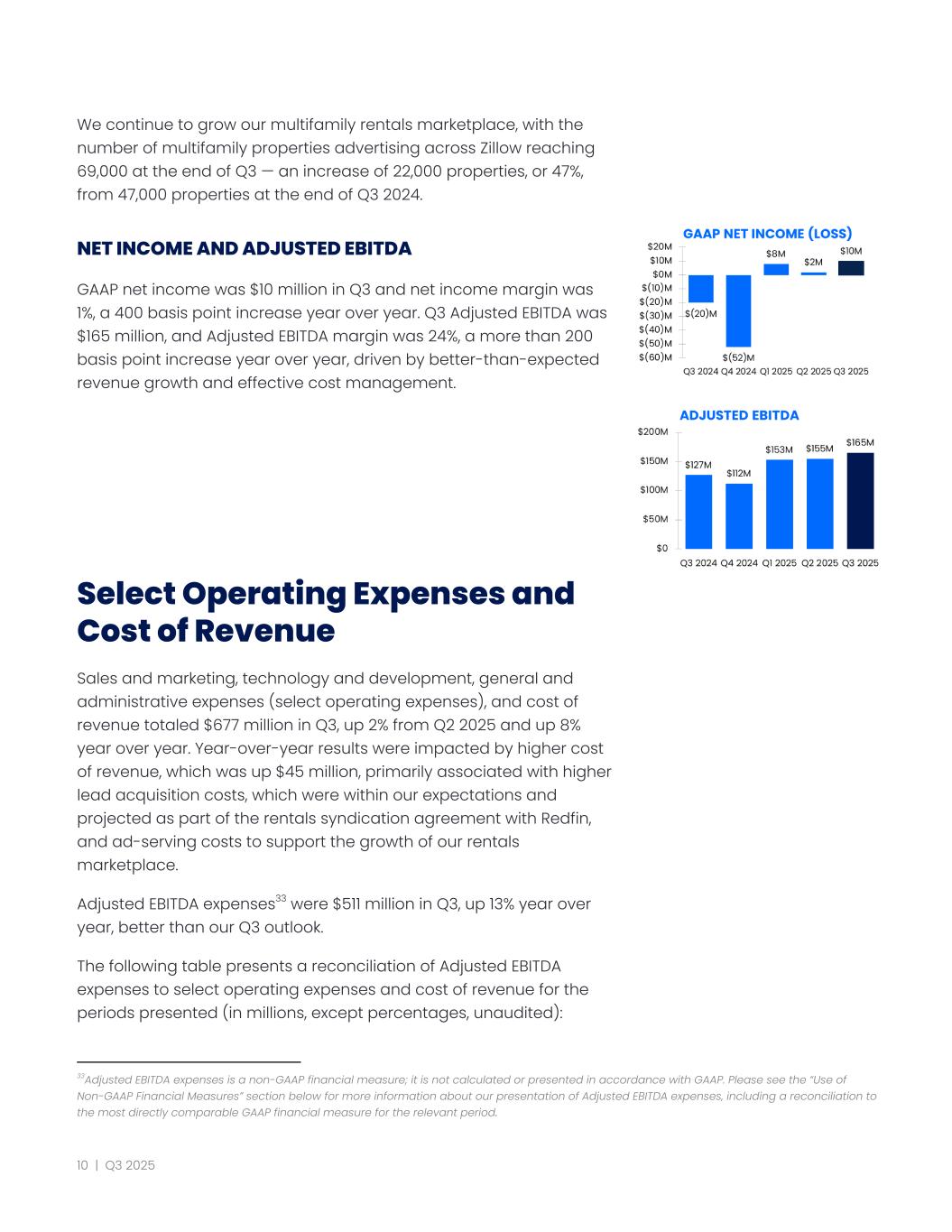 We continue to grow our multifamily rentals marketplace, with the number of multifamily properties advertising across Zillow reaching 69,000 at the end of Q3 — an increase of 22,000 properties, or 47%, from 47,000 properties at the end of Q3 2024. NET INCOME AND ADJUSTED EBITDA GAAP net income was $10 million in Q3 and net income margin was 1%, a 400 basis point increase year over year. Q3 Adjusted EBITDA was $165 million, and Adjusted EBITDA margin was 24%, a more than 200 basis point increase year over year, driven by better-than-expected revenue growth and effective cost management. Select Operating Expenses and Cost of Revenue Sales and marketing, technology and development, general and administrative expenses (select operating expenses), and cost of revenue totaled $677 million in Q3, up 2% from Q2 2025 and up 8% year over year. Year-over-year results were impacted by higher cost of revenue, which was up $45 million, primarily associated with higher lead acquisition costs, which were within our expectations and projected as part of the rentals syndication agreement with Redfin, and ad-serving costs to support the growth of our rentals marketplace. Adjusted EBITDA expenses33 were $511 million in Q3, up 13% year over year, better than our Q3 outlook. The following table presents a reconciliation of Adjusted EBITDA expenses to select operating expenses and cost of revenue for the periods presented (in millions, except percentages, unaudited): 33Adjusted EBITDA expenses is a non-GAAP financial measure; it is not calculated or presented in accordance with GAAP. Please see the “Use of Non-GAAP Financial Measures” section below for more information about our presentation of Adjusted EBITDA expenses, including a reconciliation to the most directly comparable GAAP financial measure for the relevant period. 10 | Q3 2025
