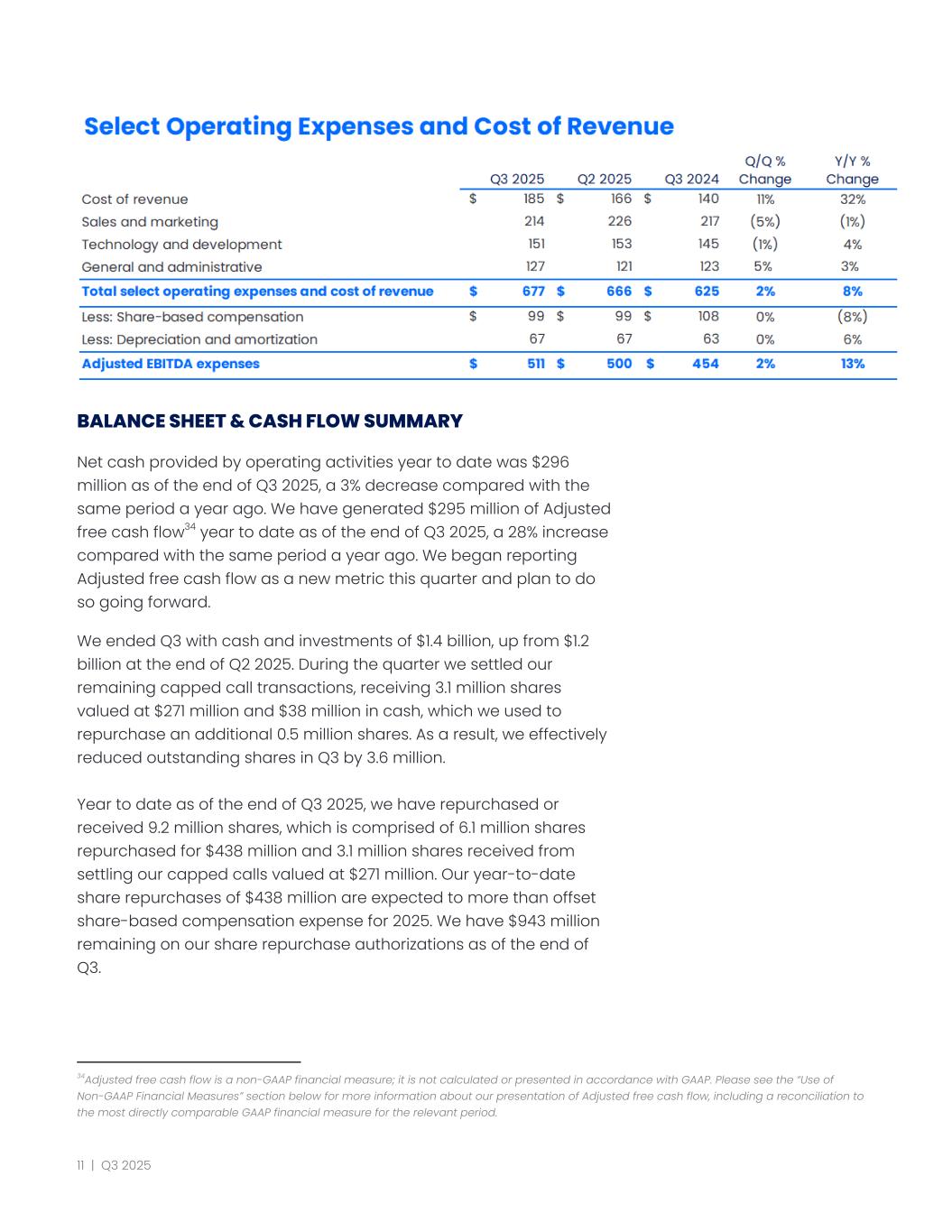 BALANCE SHEET & CASH FLOW SUMMARY Net cash provided by operating activities year to date was $296 million as of the end of Q3 2025, a 3% decrease compared with the same period a year ago. We have generated $295 million of Adjusted free cash flow34 year to date as of the end of Q3 2025, a 28% increase compared with the same period a year ago. We began reporting Adjusted free cash flow as a new metric this quarter and plan to do so going forward. We ended Q3 with cash and investments of $1.4 billion, up from $1.2 billion at the end of Q2 2025. During the quarter we settled our remaining capped call transactions, receiving 3.1 million shares valued at $271 million and $38 million in cash, which we used to repurchase an additional 0.5 million shares. As a result, we effectively reduced outstanding shares in Q3 by 3.6 million. ​ ​ Year to date as of the end of Q3 2025, we have repurchased or received 9.2 million shares, which is comprised of 6.1 million shares repurchased for $438 million and 3.1 million shares received from settling our capped calls valued at $271 million. Our year-to-date share repurchases of $438 million are expected to more than offset share-based compensation expense for 2025. We have $943 million remaining on our share repurchase authorizations as of the end of Q3. 34Adjusted free cash flow is a non-GAAP financial measure; it is not calculated or presented in accordance with GAAP. Please see the “Use of Non-GAAP Financial Measures” section below for more information about our presentation of Adjusted free cash flow, including a reconciliation to the most directly comparable GAAP financial measure for the relevant period. 11 | Q3 2025