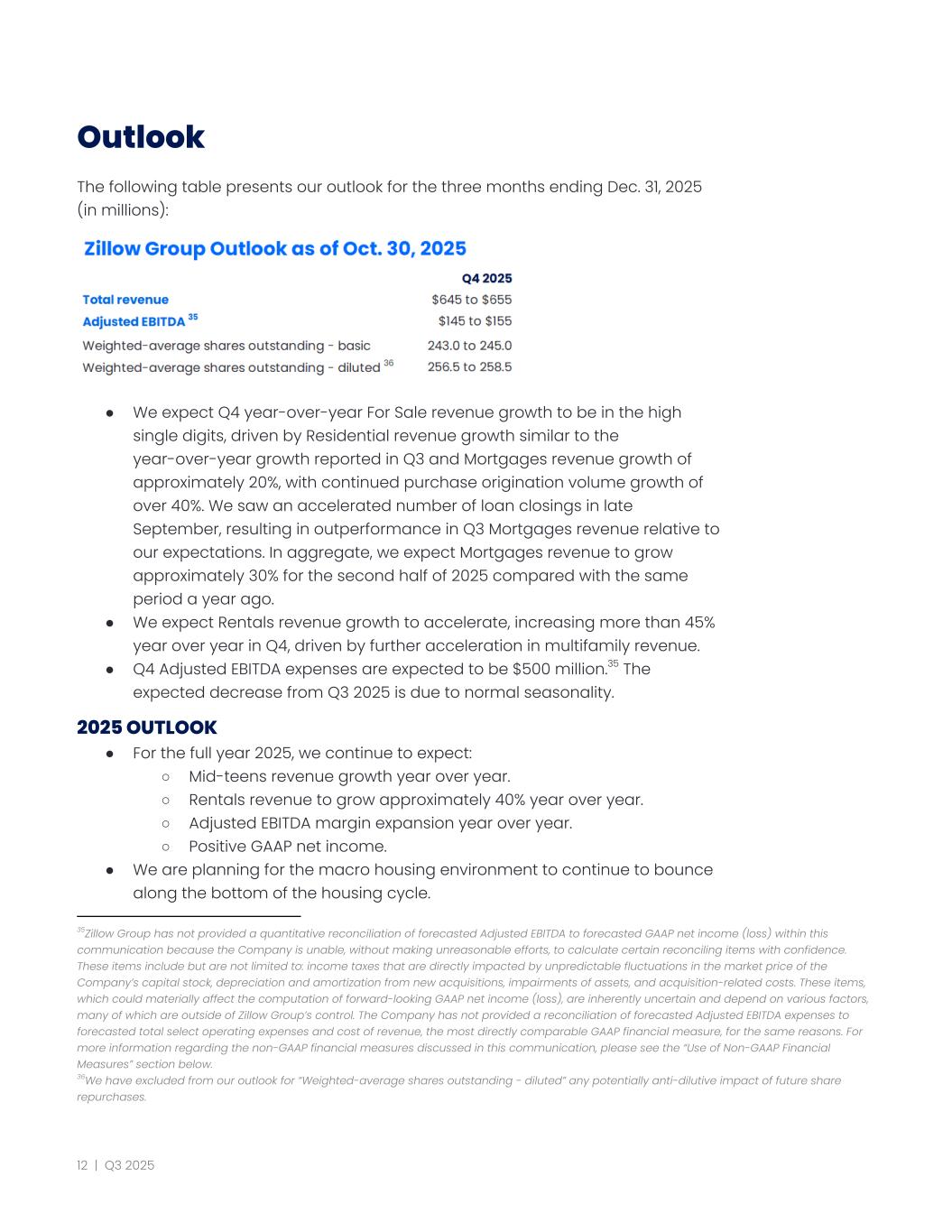 Outlook The following table presents our outlook for the three months ending Dec. 31, 2025 (in millions): 3536 ●​ We expect Q4 year-over-year For Sale revenue growth to be in the high single digits, driven by Residential revenue growth similar to the year-over-year growth reported in Q3 and Mortgages revenue growth of approximately 20%, with continued purchase origination volume growth of over 40%. We saw an accelerated number of loan closings in late September, resulting in outperformance in Q3 Mortgages revenue relative to our expectations. In aggregate, we expect Mortgages revenue to grow approximately 30% for the second half of 2025 compared with the same period a year ago. ●​ We expect Rentals revenue growth to accelerate, increasing more than 45% year over year in Q4, driven by further acceleration in multifamily revenue. ●​ Q4 Adjusted EBITDA expenses are expected to be $500 million.35 The expected decrease from Q3 2025 is due to normal seasonality. 2025 OUTLOOK ●​ For the full year 2025, we continue to expect: ○​ Mid-teens revenue growth year over year. ○​ Rentals revenue to grow approximately 40% year over year. ○​ Adjusted EBITDA margin expansion year over year. ○​ Positive GAAP net income. ●​ We are planning for the macro housing environment to continue to bounce along the bottom of the housing cycle. 36We have excluded from our outlook for “Weighted-average shares outstanding - diluted” any potentially anti-dilutive impact of future share repurchases. 35Zillow Group has not provided a quantitative reconciliation of forecasted Adjusted EBITDA to forecasted GAAP net income (loss) within this communication because the Company is unable, without making unreasonable efforts, to calculate certain reconciling items with confidence. These items include but are not limited to: income taxes that are directly impacted by unpredictable fluctuations in the market price of the Company’s capital stock, depreciation and amortization from new acquisitions, impairments of assets, and acquisition-related costs. These items, which could materially affect the computation of forward-looking GAAP net income (loss), are inherently uncertain and depend on various factors, many of which are outside of Zillow Group’s control. The Company has not provided a reconciliation of forecasted Adjusted EBITDA expenses to forecasted total select operating expenses and cost of revenue, the most directly comparable GAAP financial measure, for the same reasons. For more information regarding the non-GAAP financial measures discussed in this communication, please see the “Use of Non-GAAP Financial Measures” section below. 12 | Q3 2025