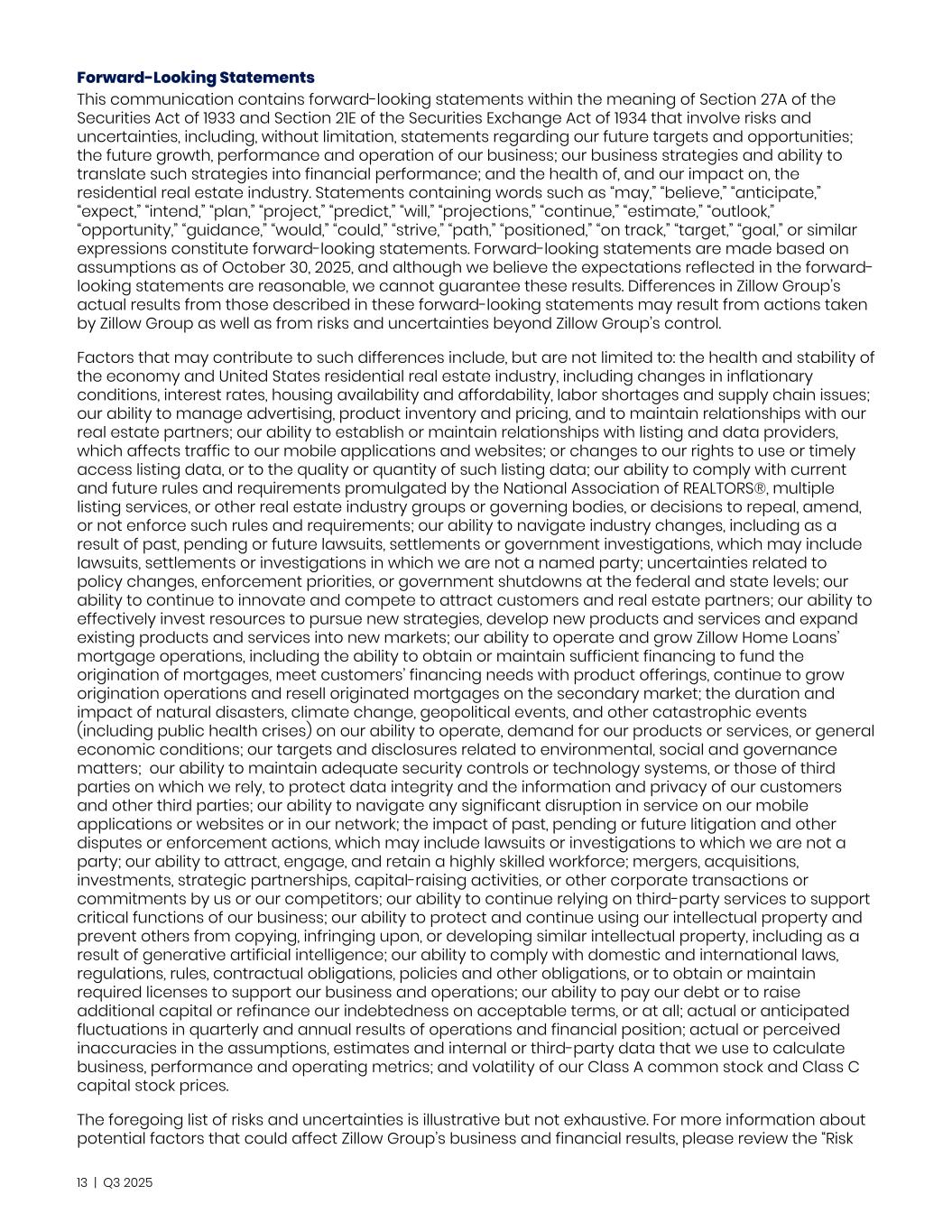 Forward-Looking Statements This communication contains forward-looking statements within the meaning of Section 27A of the Securities Act of 1933 and Section 21E of the Securities Exchange Act of 1934 that involve risks and uncertainties, including, without limitation, statements regarding our future targets and opportunities; the future growth, performance and operation of our business; our business strategies and ability to translate such strategies into financial performance; and the health of, and our impact on, the residential real estate industry. Statements containing words such as “may,” “believe,” “anticipate,” “expect,” “intend,” “plan,” “project,” “predict,” “will,” “projections,” “continue,” “estimate,” “outlook,” “opportunity,” “guidance,” “would,” “could,” “strive,” “path,” “positioned,” “on track,” “target,” “goal,” or similar expressions constitute forward-looking statements. Forward-looking statements are made based on assumptions as of October 30, 2025, and although we believe the expectations reflected in the forward- looking statements are reasonable, we cannot guarantee these results. Differences in Zillow Group’s actual results from those described in these forward-looking statements may result from actions taken by Zillow Group as well as from risks and uncertainties beyond Zillow Group’s control. Factors that may contribute to such differences include, but are not limited to: the health and stability of the economy and United States residential real estate industry, including changes in inflationary conditions, interest rates, housing availability and affordability, labor shortages and supply chain issues; our ability to manage advertising, product inventory and pricing, and to maintain relationships with our real estate partners; our ability to establish or maintain relationships with listing and data providers, which affects traffic to our mobile applications and websites; or changes to our rights to use or timely access listing data, or to the quality or quantity of such listing data; our ability to comply with current and future rules and requirements promulgated by the National Association of REALTORS®, multiple listing services, or other real estate industry groups or governing bodies, or decisions to repeal, amend, or not enforce such rules and requirements; our ability to navigate industry changes, including as a result of past, pending or future lawsuits, settlements or government investigations, which may include lawsuits, settlements or investigations in which we are not a named party; uncertainties related to policy changes, enforcement priorities, or government shutdowns at the federal and state levels; our ability to continue to innovate and compete to attract customers and real estate partners; our ability to effectively invest resources to pursue new strategies, develop new products and services and expand existing products and services into new markets; our ability to operate and grow Zillow Home Loans’ mortgage operations, including the ability to obtain or maintain sufficient financing to fund the origination of mortgages, meet customers’ financing needs with product offerings, continue to grow origination operations and resell originated mortgages on the secondary market; the duration and impact of natural disasters, climate change, geopolitical events, and other catastrophic events (including public health crises) on our ability to operate, demand for our products or services, or general economic conditions; our targets and disclosures related to environmental, social and governance matters; our ability to maintain adequate security controls or technology systems, or those of third parties on which we rely, to protect data integrity and the information and privacy of our customers and other third parties; our ability to navigate any significant disruption in service on our mobile applications or websites or in our network; the impact of past, pending or future litigation and other disputes or enforcement actions, which may include lawsuits or investigations to which we are not a party; our ability to attract, engage, and retain a highly skilled workforce; mergers, acquisitions, investments, strategic partnerships, capital-raising activities, or other corporate transactions or commitments by us or our competitors; our ability to continue relying on third-party services to support critical functions of our business; our ability to protect and continue using our intellectual property and prevent others from copying, infringing upon, or developing similar intellectual property, including as a result of generative artificial intelligence; our ability to comply with domestic and international laws, regulations, rules, contractual obligations, policies and other obligations, or to obtain or maintain required licenses to support our business and operations; our ability to pay our debt or to raise additional capital or refinance our indebtedness on acceptable terms, or at all; actual or anticipated fluctuations in quarterly and annual results of operations and financial position; actual or perceived inaccuracies in the assumptions, estimates and internal or third-party data that we use to calculate business, performance and operating metrics; and volatility of our Class A common stock and Class C capital stock prices. The foregoing list of risks and uncertainties is illustrative but not exhaustive. For more information about potential factors that could affect Zillow Group’s business and financial results, please review the “Risk 13 | Q3 2025