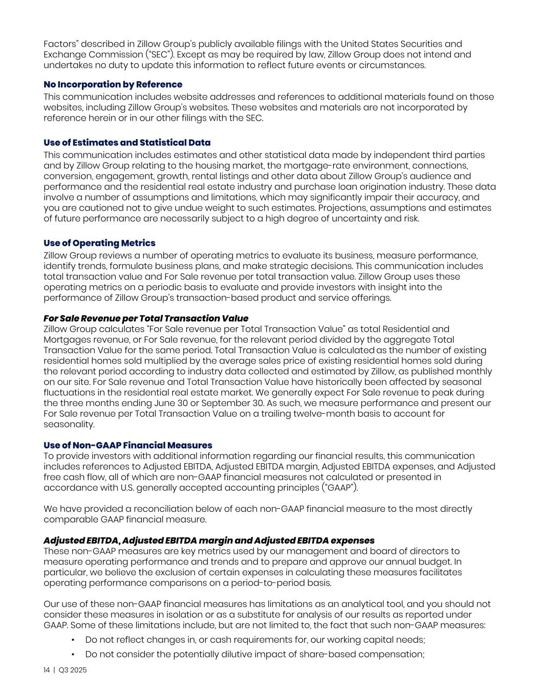 Factors” described in Zillow Group’s publicly available filings with the United States Securities and Exchange Commission (“SEC”). Except as may be required by law, Zillow Group does not intend and undertakes no duty to update this information to reflect future events or circumstances. No Incorporation by Reference This communication includes website addresses and references to additional materials found on those websites, including Zillow Group’s websites. These websites and materials are not incorporated by reference herein or in our other filings with the SEC. Use of Estimates and Statistical Data This communication includes estimates and other statistical data made by independent third parties and by Zillow Group relating to the housing market, the mortgage-rate environment, connections, conversion, engagement, growth, rental listings and other data about Zillow Group’s audience and performance and the residential real estate industry and purchase loan origination industry. These data involve a number of assumptions and limitations, which may significantly impair their accuracy, and you are cautioned not to give undue weight to such estimates. Projections, assumptions and estimates of future performance are necessarily subject to a high degree of uncertainty and risk. Use of Operating Metrics Zillow Group reviews a number of operating metrics to evaluate its business, measure performance, identify trends, formulate business plans, and make strategic decisions. This communication includes total transaction value and For Sale revenue per total transaction value. Zillow Group uses these operating metrics on a periodic basis to evaluate and provide investors with insight into the performance of Zillow Group’s transaction-based product and service offerings. For Sale Revenue per Total Transaction Value Zillow Group calculates “For Sale revenue per Total Transaction Value” as total Residential and Mortgages revenue, or For Sale revenue, for the relevant period divided by the aggregate Total Transaction Value for the same period. Total Transaction Value is calculated as the number of existing residential homes sold multiplied by the average sales price of existing residential homes sold during the relevant period according to industry data collected and estimated by Zillow, as published monthly on our site. For Sale revenue and Total Transaction Value have historically been affected by seasonal fluctuations in the residential real estate market. We generally expect For Sale revenue to peak during the three months ending June 30 or September 30. As such, we measure performance and present our For Sale revenue per Total Transaction Value on a trailing twelve-month basis to account for seasonality. Use of Non-GAAP Financial Measures To provide investors with additional information regarding our financial results, this communication includes references to Adjusted EBITDA, Adjusted EBITDA margin, Adjusted EBITDA expenses, and Adjusted free cash flow, all of which are non-GAAP financial measures not calculated or presented in accordance with U.S. generally accepted accounting principles (“GAAP”). We have provided a reconciliation below of each non-GAAP financial measure to the most directly comparable GAAP financial measure. Adjusted EBITDA, Adjusted EBITDA margin and Adjusted EBITDA expenses These non-GAAP measures are key metrics used by our management and board of directors to measure operating performance and trends and to prepare and approve our annual budget. In particular, we believe the exclusion of certain expenses in calculating these measures facilitates operating performance comparisons on a period-to-period basis. Our use of these non-GAAP financial measures has limitations as an analytical tool, and you should not consider these measures in isolation or as a substitute for analysis of our results as reported under GAAP. Some of these limitations include, but are not limited to, the fact that such non-GAAP measures: • Do not reflect changes in, or cash requirements for, our working capital needs; • Do not consider the potentially dilutive impact of share-based compensation; 14 | Q3 2025