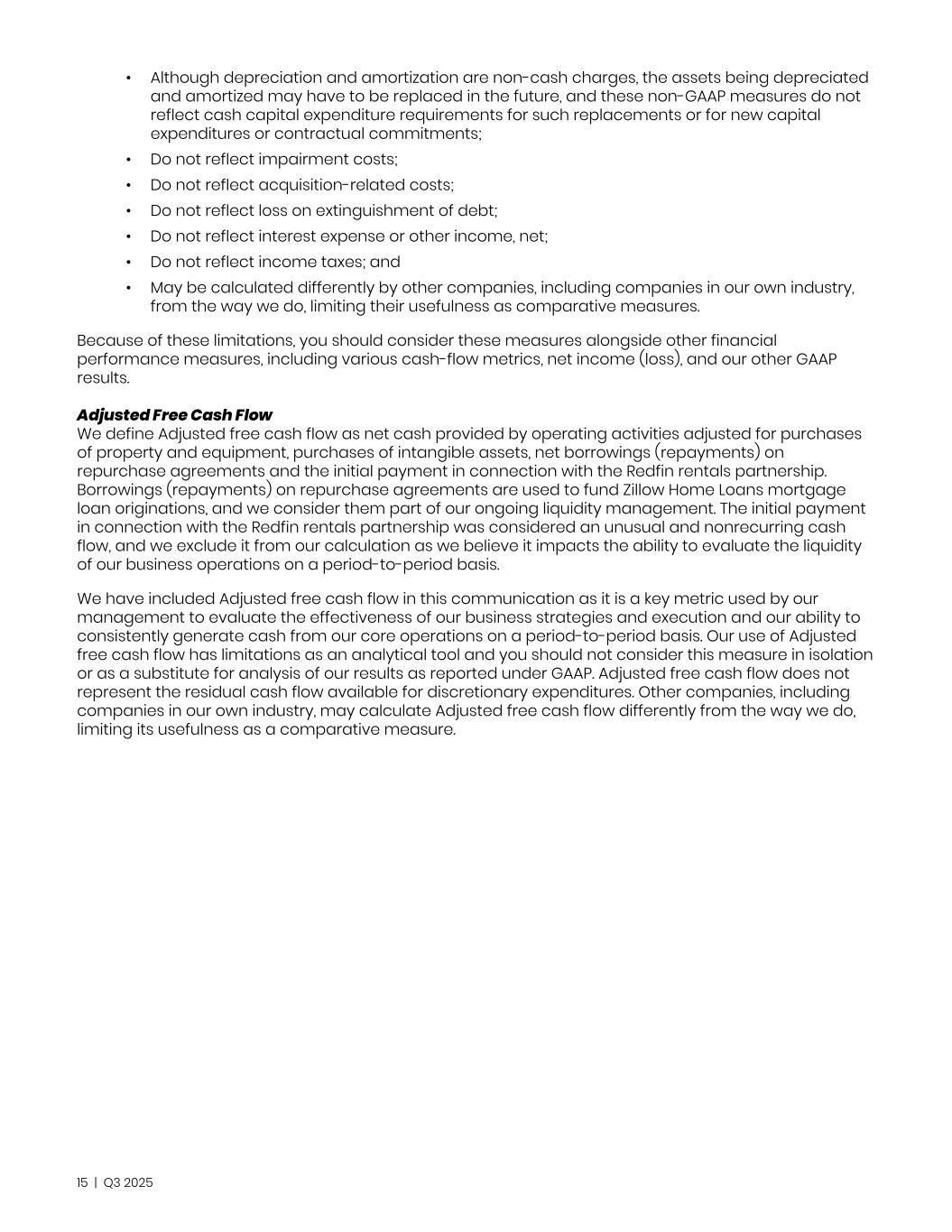 • Although depreciation and amortization are non-cash charges, the assets being depreciated and amortized may have to be replaced in the future, and these non-GAAP measures do not reflect cash capital expenditure requirements for such replacements or for new capital expenditures or contractual commitments; • Do not reflect impairment costs; • Do not reflect acquisition-related costs; • Do not reflect loss on extinguishment of debt; • Do not reflect interest expense or other income, net; • Do not reflect income taxes; and • May be calculated differently by other companies, including companies in our own industry, from the way we do, limiting their usefulness as comparative measures. Because of these limitations, you should consider these measures alongside other financial performance measures, including various cash-flow metrics, net income (loss), and our other GAAP results. Adjusted Free Cash Flow We define Adjusted free cash flow as net cash provided by operating activities adjusted for purchases of property and equipment, purchases of intangible assets, net borrowings (repayments) on repurchase agreements and the initial payment in connection with the Redfin rentals partnership. Borrowings (repayments) on repurchase agreements are used to fund Zillow Home Loans mortgage loan originations, and we consider them part of our ongoing liquidity management. The initial payment in connection with the Redfin rentals partnership was considered an unusual and nonrecurring cash flow, and we exclude it from our calculation as we believe it impacts the ability to evaluate the liquidity of our business operations on a period-to-period basis. We have included Adjusted free cash flow in this communication as it is a key metric used by our management to evaluate the effectiveness of our business strategies and execution and our ability to consistently generate cash from our core operations on a period-to-period basis. Our use of Adjusted free cash flow has limitations as an analytical tool and you should not consider this measure in isolation or as a substitute for analysis of our results as reported under GAAP. Adjusted free cash flow does not represent the residual cash flow available for discretionary expenditures. Other companies, including companies in our own industry, may calculate Adjusted free cash flow differently from the way we do, limiting its usefulness as a comparative measure. 15 | Q3 2025