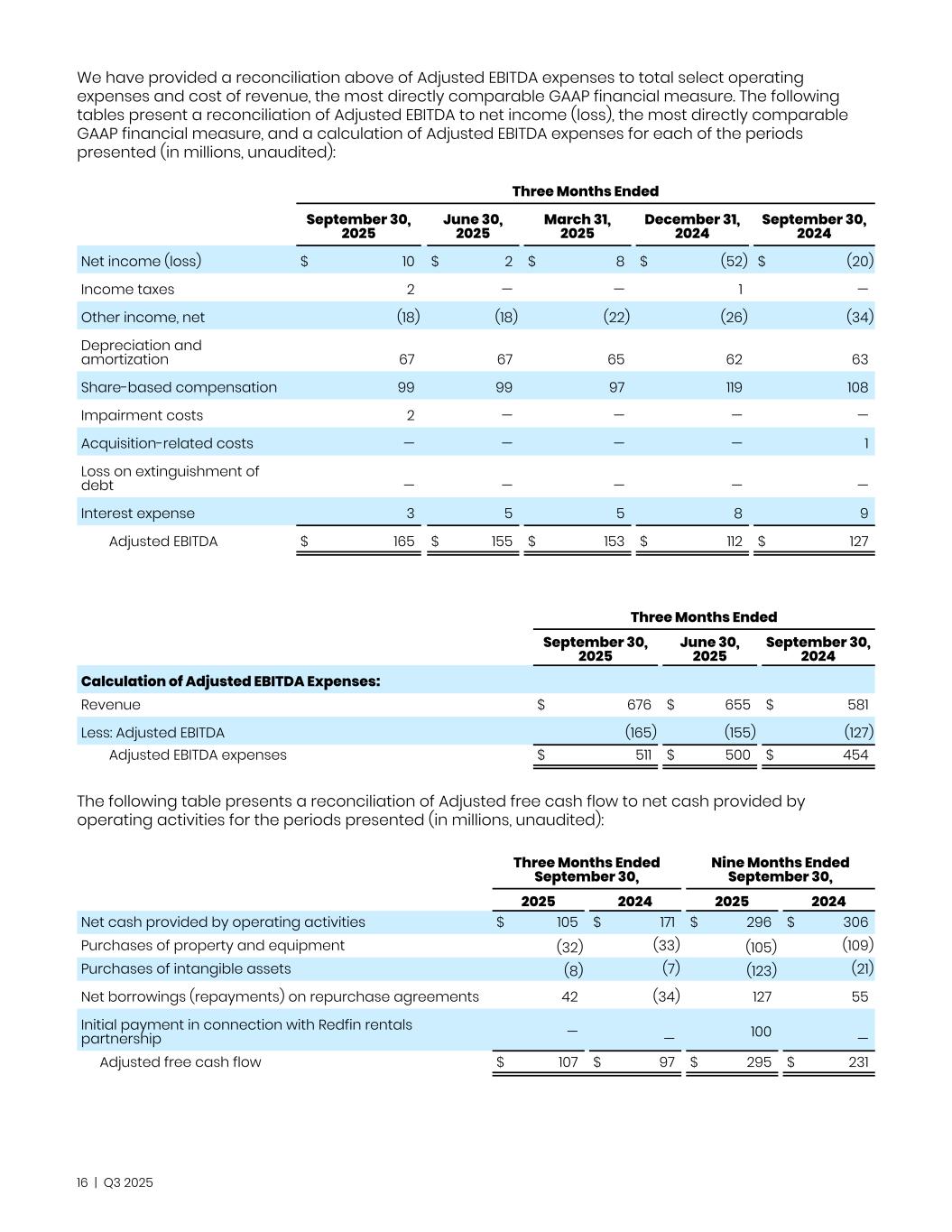 We have provided a reconciliation above of Adjusted EBITDA expenses to total select operating expenses and cost of revenue, the most directly comparable GAAP financial measure. The following tables present a reconciliation of Adjusted EBITDA to net income (loss), the most directly comparable GAAP financial measure, and a calculation of Adjusted EBITDA expenses for each of the periods presented (in millions, unaudited): Three Months Ended September 30, 2025 June 30, 2025 March 31, 2025 December 31, 2024 September 30, 2024 Net income (loss) $ 10 $ 2 $ 8 $ (52) $ (20) Income taxes 2 — — 1 — Other income, net (18) (18) (22) (26) (34) Depreciation and amortization 67 67 65 62 63 Share-based compensation 99 99 97 119 108 Impairment costs 2 — — — — Acquisition-related costs — — — — 1 Loss on extinguishment of debt — — — — — Interest expense 3 5 5 8 9 Adjusted EBITDA $ 165 $ 155 $ 153 $ 112 $ 127 Three Months Ended September 30, 2025 June 30, 2025 September 30, 2024 Calculation of Adjusted EBITDA Expenses: Revenue $ 676 $ 655 $ 581 Less: Adjusted EBITDA (165) (155) (127) Adjusted EBITDA expenses $ 511 $ 500 $ 454 The following table presents a reconciliation of Adjusted free cash flow to net cash provided by operating activities for the periods presented (in millions, unaudited):   Three Months Ended September 30, Nine Months Ended September 30, 2025 2024 2025 2024 Net cash provided by operating activities $ 105 $ 171 $ 296 $ 306 Purchases of property and equipment (32) (33) (105) (109) Purchases of intangible assets (8) (7) (123) (21) Net borrowings (repayments) on repurchase agreements 42 (34) 127 55 Initial payment in connection with Redfin rentals partnership — — 100 — Adjusted free cash flow $ 107 $ 97 $ 295 $ 231 16 | Q3 2025