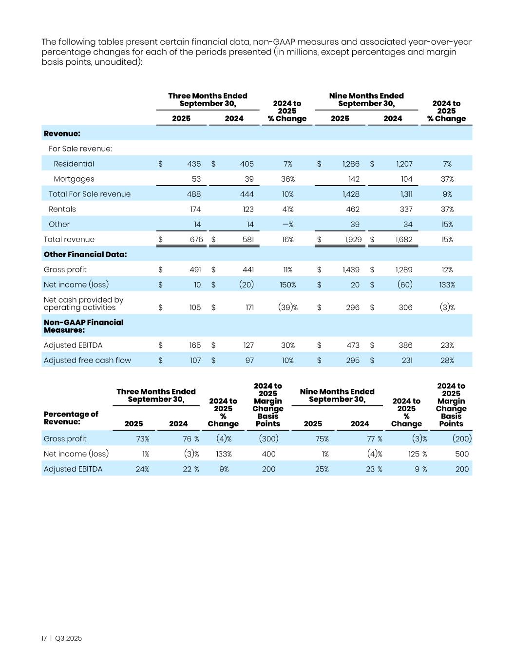 The following tables present certain financial data, non-GAAP measures and associated year-over-year percentage changes for each of the periods presented (in millions, except percentages and margin basis points, unaudited): Three Months Ended September 30, 2024 to 2025 % Change Nine Months Ended September 30, 2024 to 2025 % Change2025 2024 2025 2024 Revenue: For Sale revenue: Residential $ 435 $ 405 7% $ 1,286 $ 1,207 7% Mortgages 53 39 36% 142 104 37% Total For Sale revenue 488 444 10% 1,428 1,311 9% Rentals 174 123 41% 462 337 37% Other 14 14 —% 39 34 15% Total revenue $ 676 $ 581 16% $ 1,929 $ 1,682 15% Other Financial Data: Gross profit $ 491 $ 441 11% $ 1,439 $ 1,289 12% Net income (loss) $ 10 $ (20) 150% $ 20 $ (60) 133% Net cash provided by operating activities $ 105 $ 171 (39)% $ 296 $ 306 (3)% Non-GAAP Financial Measures: Adjusted EBITDA $ 165 $ 127 30% $ 473 $ 386 23% Adjusted free cash flow $ 107 $ 97 10% $ 295 $ 231 28% Three Months Ended September 30, 2024 to 2025 % Change 2024 to 2025 Margin Change Basis Points Nine Months Ended September 30, 2024 to 2025 % Change 2024 to 2025 Margin Change Basis Points Percentage of Revenue: 2025 2024 2025 2024 Gross profit 73 % 76 % (4)% (300) 75 % 77 % (3) % (200) Net income (loss) 1 % (3) % 133% 400 1 % (4) % 125 % 500 Adjusted EBITDA 24 % 22 % 9% 200 25 % 23 % 9 % 200 17 | Q3 2025