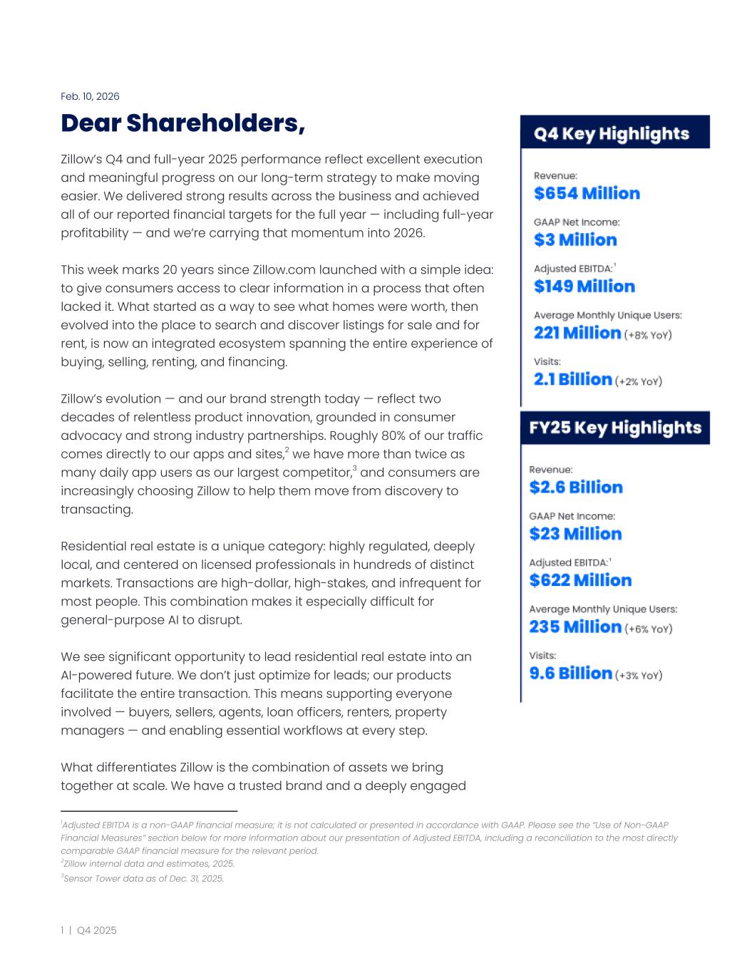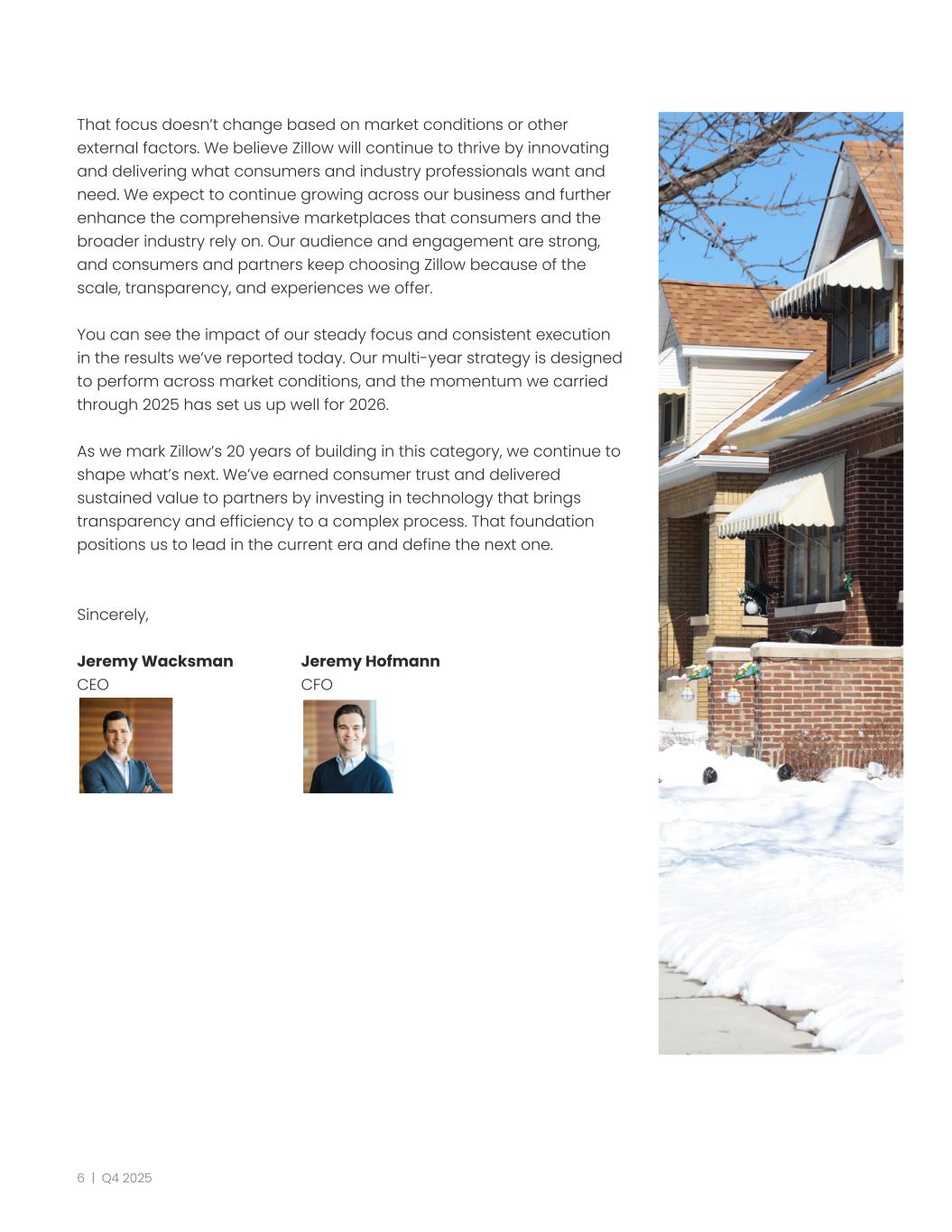 That focus doesn’t change based on market conditions or other external factors. We believe Zillow will continue to thrive by innovating and delivering what consumers and industry professionals want and need. We expect to continue growing across our business and further enhance the comprehensive marketplaces that consumers and the broader industry rely on. Our audience and engagement are strong, and consumers and partners keep choosing Zillow because of the scale, transparency, and experiences we offer. You can see the impact of our steady focus and consistent execution in the results we’ve reported today. Our multi-year strategy is designed to perform across market conditions, and the momentum we carried through 2025 has set us up well for 2026. As we mark Zillow’s 20 years of building in this category, we continue to shape what’s next. We’ve earned consumer trust and delivered sustained value to partners by investing in technology that brings transparency and efficiency to a complex process. That foundation positions us to lead in the current era and define the next one. Sincerely, Jeremy Wacksman​ ​ Jeremy Hofmann CEO​ ​ ​ ​ CFO ​ ​ ​ 6 | Q4 2025