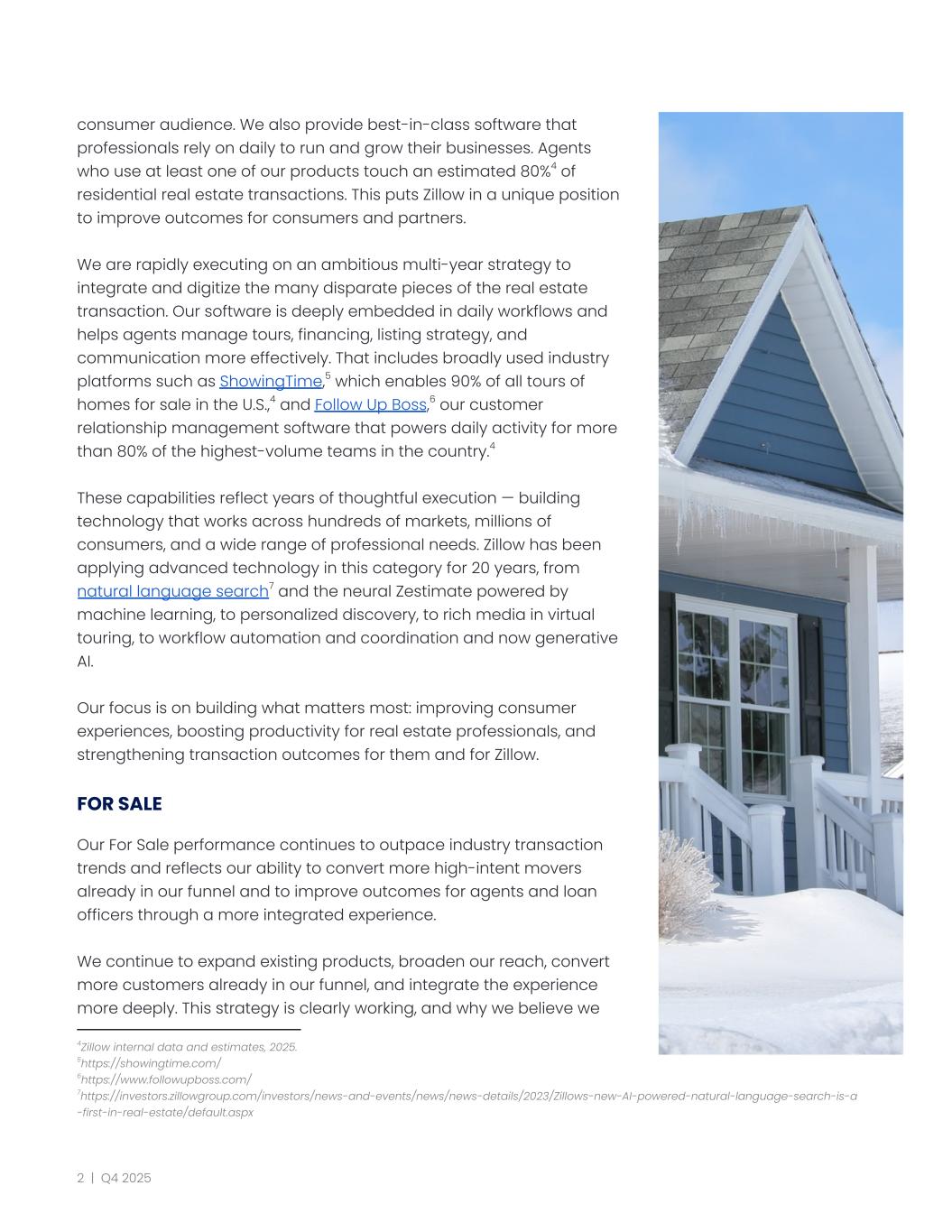 consumer audience. We also provide best-in-class software that professionals rely on daily to run and grow their businesses. Agents who use at least one of our products touch an estimated 80%4 of residential real estate transactions. This puts Zillow in a unique position to improve outcomes for consumers and partners. We are rapidly executing on an ambitious multi-year strategy to integrate and digitize the many disparate pieces of the real estate transaction. Our software is deeply embedded in daily workflows and helps agents manage tours, financing, listing strategy, and communication more effectively. That includes broadly used industry platforms such as ShowingTime,5 which enables 90% of all tours of homes for sale in the U.S.,4 and Follow Up Boss,6 our customer relationship management software that powers daily activity for more than 80% of the highest-volume teams in the country.4 These capabilities reflect years of thoughtful execution — building technology that works across hundreds of markets, millions of consumers, and a wide range of professional needs. Zillow has been applying advanced technology in this category for 20 years, from natural language search7 and the neural Zestimate powered by machine learning, to personalized discovery, to rich media in virtual touring, to workflow automation and coordination and now generative AI. Our focus is on building what matters most: improving consumer experiences, boosting productivity for real estate professionals, and strengthening transaction outcomes for them and for Zillow. FOR SALE Our For Sale performance continues to outpace industry transaction trends and reflects our ability to convert more high-intent movers already in our funnel and to improve outcomes for agents and loan officers through a more integrated experience. We continue to expand existing products, broaden our reach, convert more customers already in our funnel, and integrate the experience more deeply. This strategy is clearly working, and why we believe we 7https://investors.zillowgroup.com/investors/news-and-events/news/news-details/2023/Zillows-new-AI-powered-natural-language-search-is-a -first-in-real-estate/default.aspx 6https://www.followupboss.com/ 5https://showingtime.com/ 4Zillow internal data and estimates, 2025. 2 | Q4 2025