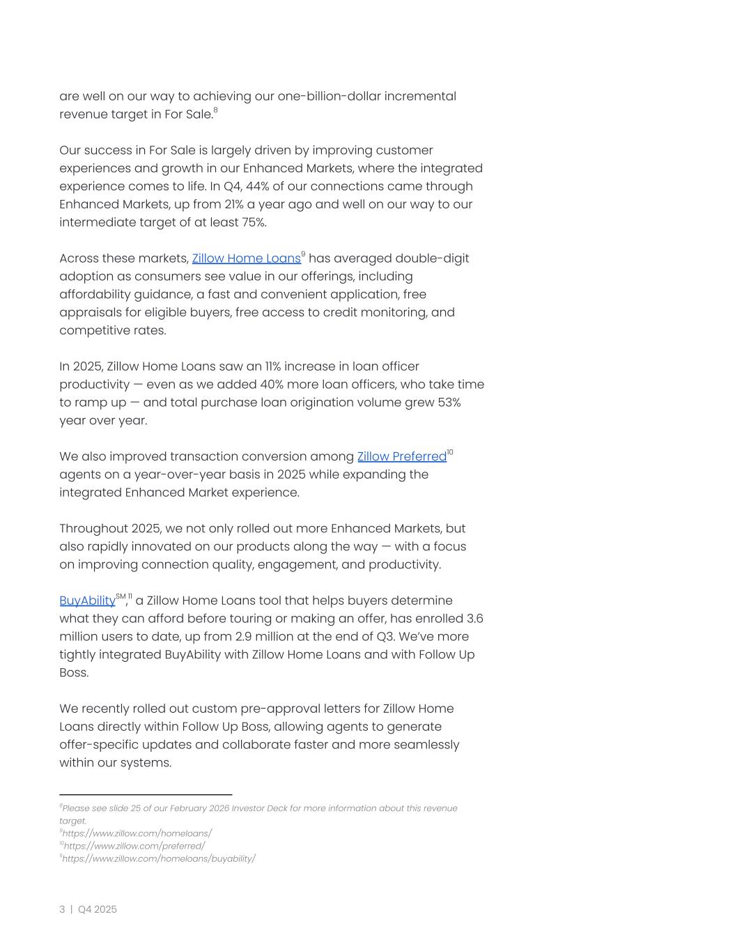 are well on our way to achieving our one-billion-dollar incremental revenue target in For Sale.8 Our success in For Sale is largely driven by improving customer experiences and growth in our Enhanced Markets, where the integrated experience comes to life. In Q4, 44% of our connections came through Enhanced Markets, up from 21% a year ago and well on our way to our intermediate target of at least 75%. Across these markets, Zillow Home Loans9 has averaged double-digit adoption as consumers see value in our offerings, including affordability guidance, a fast and convenient application, free appraisals for eligible buyers, free access to credit monitoring, and competitive rates. In 2025, Zillow Home Loans saw an 11% increase in loan officer productivity — even as we added 40% more loan officers, who take time to ramp up — and total purchase loan origination volume grew 53% year over year. We also improved transaction conversion among Zillow Preferred10 agents on a year-over-year basis in 2025 while expanding the integrated Enhanced Market experience. Throughout 2025, we not only rolled out more Enhanced Markets, but also rapidly innovated on our products along the way — with a focus on improving connection quality, engagement, and productivity. BuyAbilitySM,11 a Zillow Home Loans tool that helps buyers determine what they can afford before touring or making an offer, has enrolled 3.6 million users to date, up from 2.9 million at the end of Q3. We’ve more tightly integrated BuyAbility with Zillow Home Loans and with Follow Up Boss. We recently rolled out custom pre-approval letters for Zillow Home Loans directly within Follow Up Boss, allowing agents to generate offer-specific updates and collaborate faster and more seamlessly within our systems. 11https://www.zillow.com/homeloans/buyability/ 10https://www.zillow.com/preferred/ 9https://www.zillow.com/homeloans/ 8Please see slide 25 of our February 2026 Investor Deck for more information about this revenue target. 3 | Q4 2025