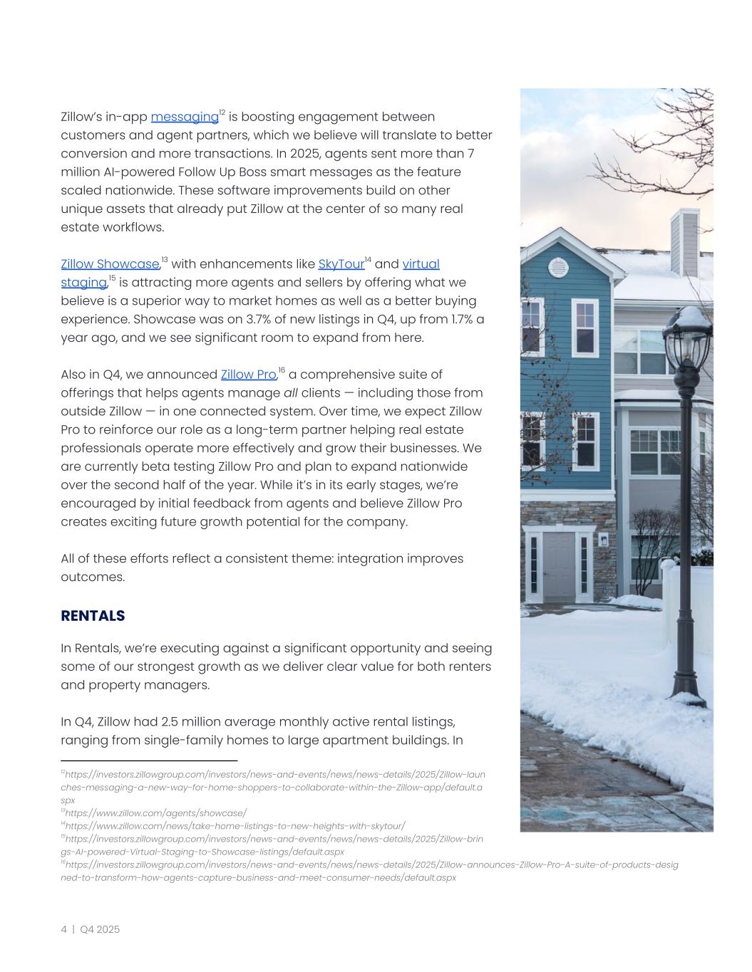 Zillow’s in-app messaging12 is boosting engagement between customers and agent partners, which we believe will translate to better conversion and more transactions. In 2025, agents sent more than 7 million AI-powered Follow Up Boss smart messages as the feature scaled nationwide. These software improvements build on other unique assets that already put Zillow at the center of so many real estate workflows. Zillow Showcase,13 with enhancements like SkyTour14 and virtual staging,15 is attracting more agents and sellers by offering what we believe is a superior way to market homes as well as a better buying experience. Showcase was on 3.7% of new listings in Q4, up from 1.7% a year ago, and we see significant room to expand from here. Also in Q4, we announced Zillow Pro,16 a comprehensive suite of offerings that helps agents manage all clients — including those from outside Zillow — in one connected system. Over time, we expect Zillow Pro to reinforce our role as a long-term partner helping real estate professionals operate more effectively and grow their businesses. We are currently beta testing Zillow Pro and plan to expand nationwide over the second half of the year. While it’s in its early stages, we’re encouraged by initial feedback from agents and believe Zillow Pro creates exciting future growth potential for the company. All of these efforts reflect a consistent theme: integration improves outcomes. RENTALS In Rentals, we’re executing against a significant opportunity and seeing some of our strongest growth as we deliver clear value for both renters and property managers. In Q4, Zillow had 2.5 million average monthly active rental listings, ranging from single-family homes to large apartment buildings. In 16https://investors.zillowgroup.com/investors/news-and-events/news/news-details/2025/Zillow-announces-Zillow-Pro-A-suite-of-products-desig ned-to-transform-how-agents-capture-business-and-meet-consumer-needs/default.aspx 15https://investors.zillowgroup.com/investors/news-and-events/news/news-details/2025/Zillow-brin gs-AI-powered-Virtual-Staging-to-Showcase-listings/default.aspx 14https://www.zillow.com/news/take-home-listings-to-new-heights-with-skytour/ 13https://www.zillow.com/agents/showcase/ 12https://investors.zillowgroup.com/investors/news-and-events/news/news-details/2025/Zillow-laun ches-messaging-a-new-way-for-home-shoppers-to-collaborate-within-the-Zillow-app/default.a spx 4 | Q4 2025