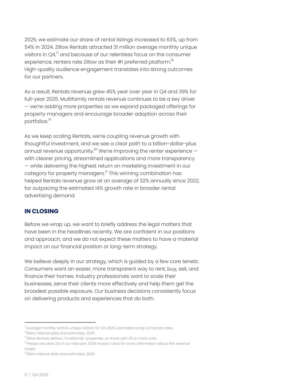 2025, we estimate our share of rental listings increased to 63%, up from 54% in 2024. Zillow Rentals attracted 31 million average monthly unique visitors in Q4,17 and because of our relentless focus on the consumer experience, renters rate Zillow as their #1 preferred platform.18 High-quality audience engagement translates into strong outcomes for our partners. As a result, Rentals revenue grew 45% year over year in Q4 and 39% for full-year 2025. Multifamily rentals revenue continues to be a key driver — we’re adding more properties as we expand packaged offerings for property managers and encourage broader adoption across their portfolios.19 As we keep scaling Rentals, we’re coupling revenue growth with thoughtful investment, and we see a clear path to a billion-dollar-plus annual revenue opportunity.20 We’re improving the renter experience — with clearer pricing, streamlined applications and more transparency — while delivering the highest return on marketing investment in our category for property managers.21 This winning combination has helped Rentals revenue grow at an average of 32% annually since 2022, far outpacing the estimated 14% growth rate in broader rental advertising demand. IN CLOSING Before we wrap up, we want to briefly address the legal matters that have been in the headlines recently. We are confident in our positions and approach, and we do not expect these matters to have a material impact on our financial position or long-term strategy. We believe deeply in our strategy, which is guided by a few core tenets: Consumers want an easier, more transparent way to rent, buy, sell, and finance their homes. Industry professionals want to scale their businesses, serve their clients more effectively and help them get the broadest possible exposure. Our business decisions consistently focus on delivering products and experiences that do both. 21Zillow internal data and estimates, 2025. 20Please see slide 28 of our February 2026 Investor Deck for more information about this revenue target. 19Zillow Rentals defines “multifamily” properties as those with 25 or more units. 18Zillow internal data and estimates, 2025. 17Average monthly rentals unique visitors for Q4 2025, estimated using Comscore data. 5 | Q4 2025
