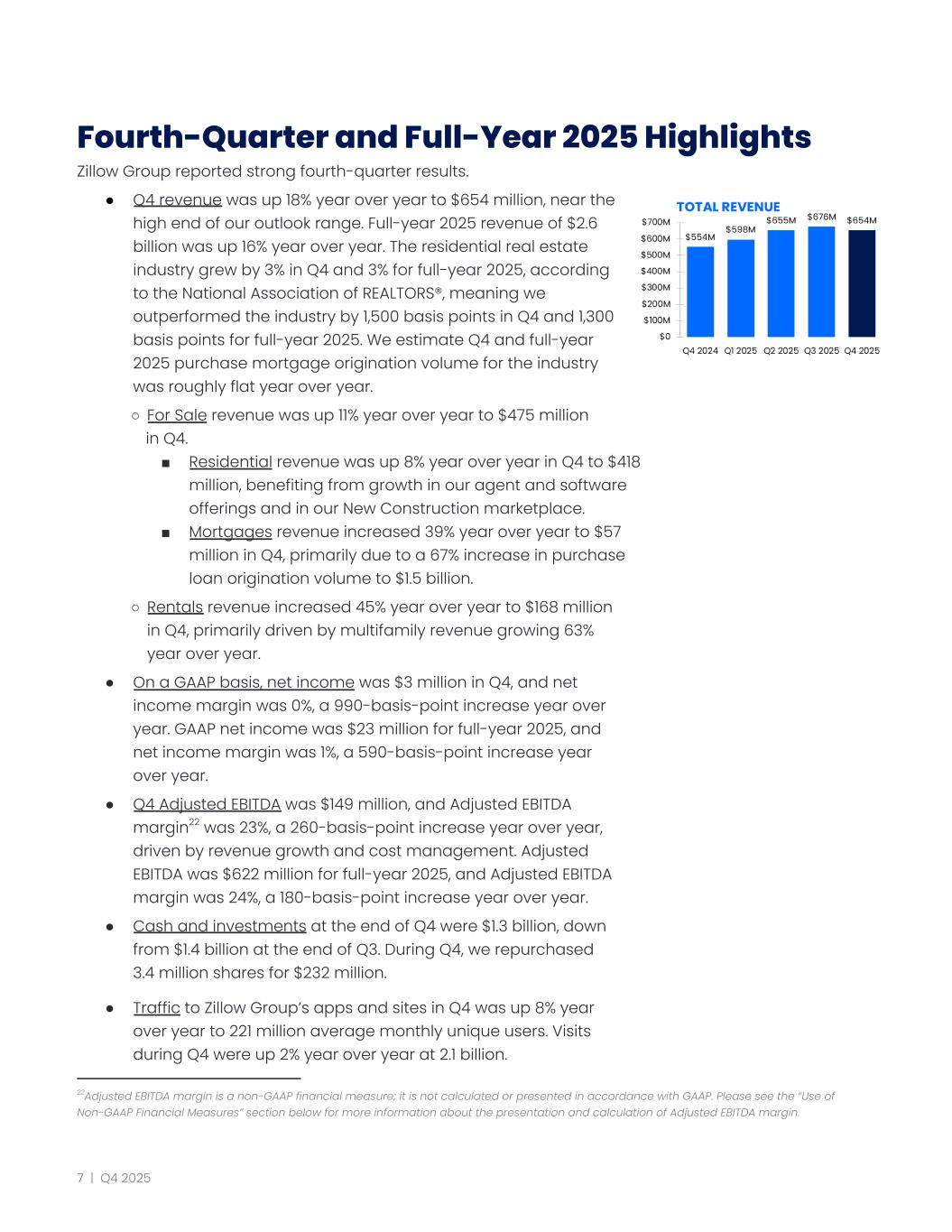 Fourth-Quarter and Full-Year 2025 Highlights Zillow Group reported strong fourth-quarter results. ●​ Q4 revenue was up 18% year over year to $654 million, near the high end of our outlook range. Full-year 2025 revenue of $2.6 billion was up 16% year over year. The residential real estate industry grew by 3% in Q4 and 3% for full-year 2025, according to the National Association of REALTORS®, meaning we outperformed the industry by 1,500 basis points in Q4 and 1,300 basis points for full-year 2025. We estimate Q4 and full-year 2025 purchase mortgage origination volume for the industry was roughly flat year over year. ○​ For Sale revenue was up 11% year over year to $475 million in Q4. ■​ Residential revenue was up 8% year over year in Q4 to $418 million, benefiting from growth in our agent and software offerings and in our New Construction marketplace. ■​ Mortgages revenue increased 39% year over year to $57 million in Q4, primarily due to a 67% increase in purchase loan origination volume to $1.5 billion. ○​ Rentals revenue increased 45% year over year to $168 million in Q4, primarily driven by multifamily revenue growing 63% year over year. ●​ On a GAAP basis, net income was $3 million in Q4, and net income margin was 0%, a 990-basis-point increase year over year. GAAP net income was $23 million for full-year 2025, and net income margin was 1%, a 590-basis-point increase year over year. ●​ Q4 Adjusted EBITDA was $149 million, and Adjusted EBITDA margin22 was 23%, a 260-basis-point increase year over year, driven by revenue growth and cost management. Adjusted EBITDA was $622 million for full-year 2025, and Adjusted EBITDA margin was 24%, a 180-basis-point increase year over year. ●​ Cash and investments at the end of Q4 were $1.3 billion, down from $1.4 billion at the end of Q3. During Q4, we repurchased 3.4 million shares for $232 million. ●​ Traffic to Zillow Group’s apps and sites in Q4 was up 8% year over year to 221 million average monthly unique users. Visits during Q4 were up 2% year over year at 2.1 billion. 22Adjusted EBITDA margin is a non-GAAP financial measure; it is not calculated or presented in accordance with GAAP. Please see the “Use of Non-GAAP Financial Measures” section below for more information about the presentation and calculation of Adjusted EBITDA margin. 7 | Q4 2025